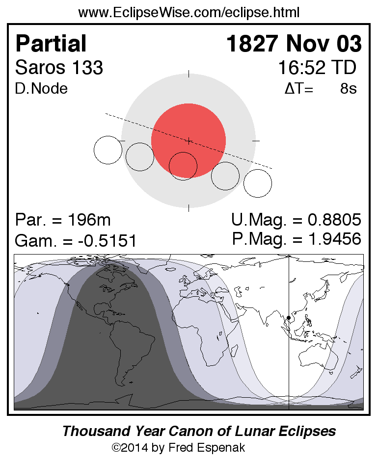 The instant of greatest eclipse takes place on 1827 Nov 03 at 16:51:55 TD (16:51:47 UT1).