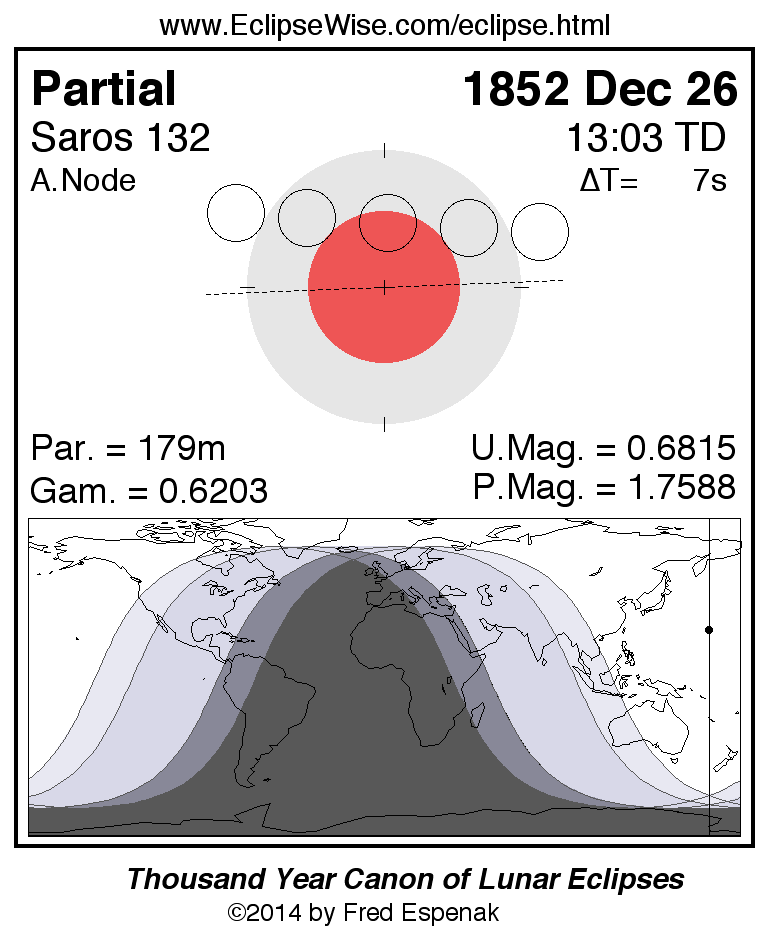 The partial lunar eclipse of 1852 Dec 26 is preceded two weeks earlier by a total solar eclipse on 1852 Dec 11.