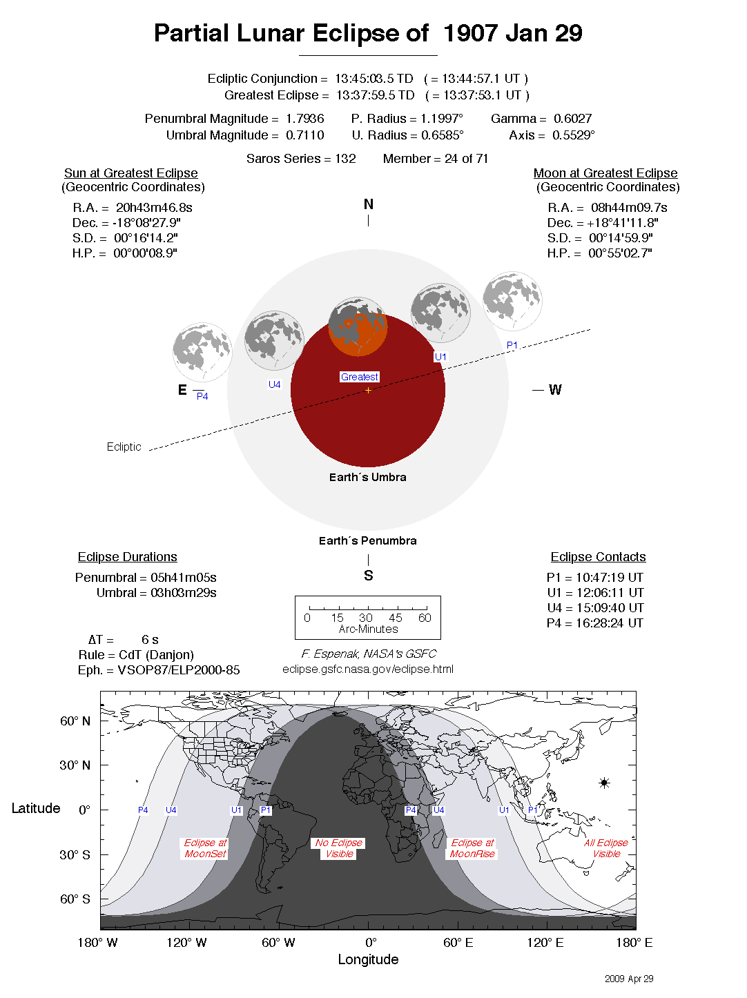 The tables below contain detailed predictions and additional information on the Partial Lunar Eclipse of 1907 Jan 29 .