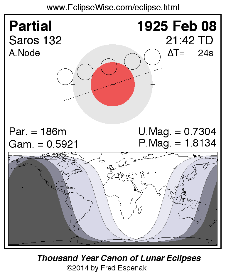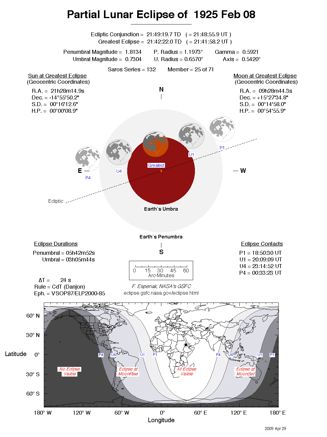The tables below contain detailed predictions and additional information on the Partial Lunar Eclipse of 1925 Feb 08 .