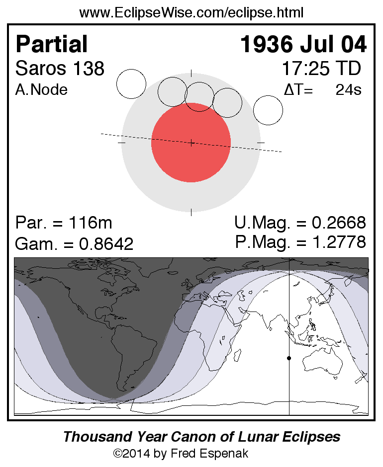 The instant of greatest eclipse takes place on 1936 Jul 04 at 17:25:23 TD (17:24:59 UT1). This is 6.9 days after the Moon reaches apogee. During the eclipse, the Moon is in the constellation Sagittarius. The synodic month in which the eclipse takes place has a Brown Lunation Number of 167.