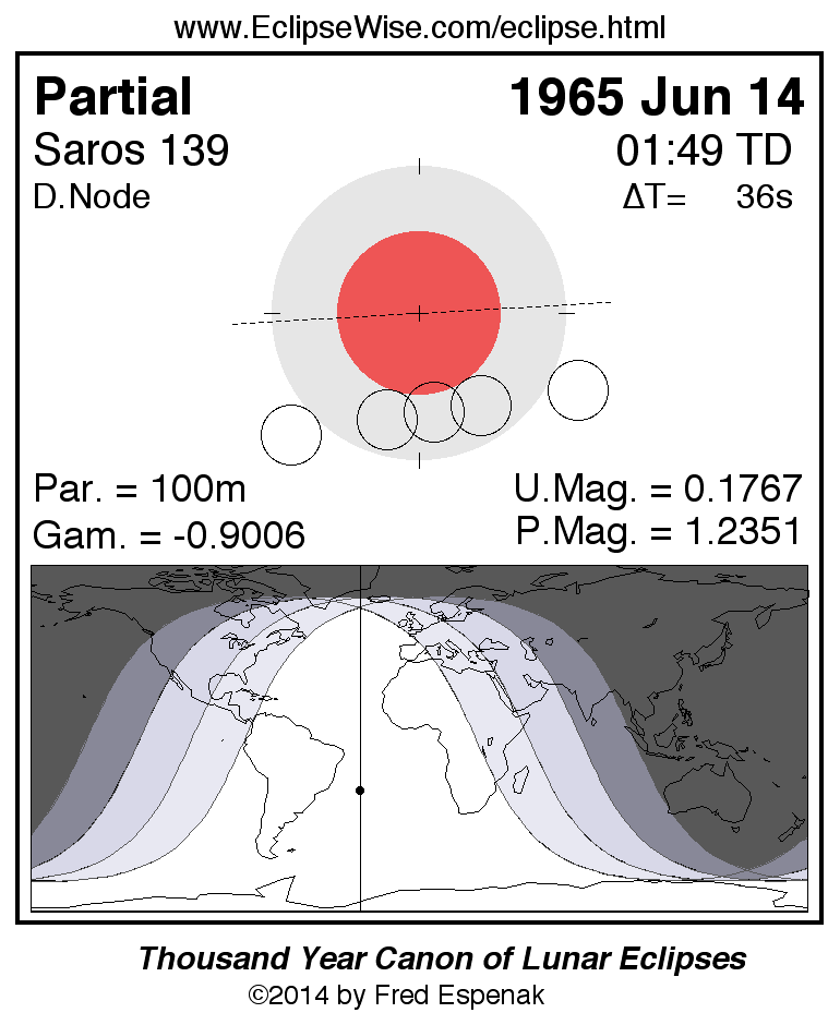 The tables below contain detailed predictions and additional information on the Partial Lunar Eclipse of 1965 Jun 14 .