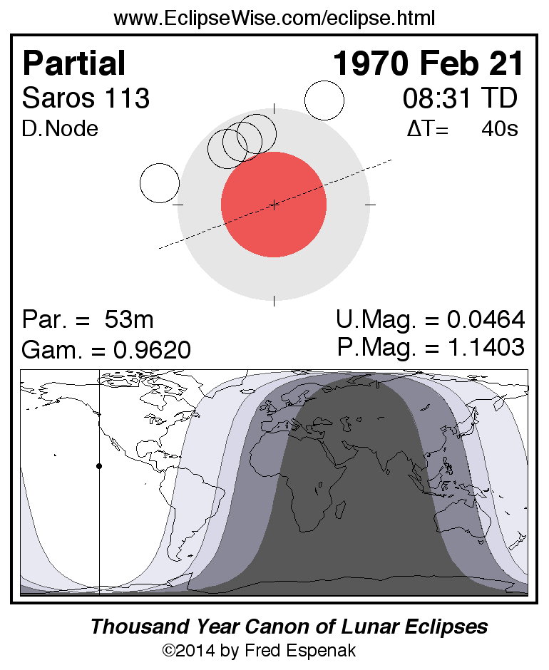 The tables below contain detailed predictions and additional information on the Partial Lunar Eclipse of 1970 Feb 21 .