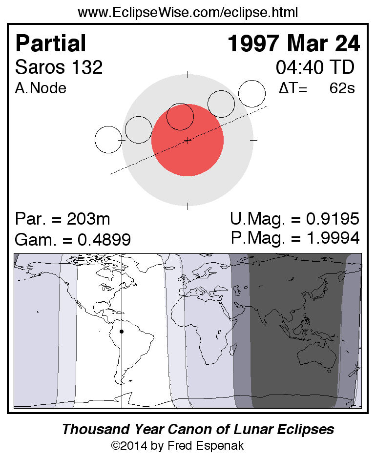 The instant of greatest eclipse takes place on 1997 Mar 24 at 04:40:28 TD (04:39:26 UT1). This is 3.2 days after the Moon reaches apogee. During the eclipse, the Moon is in the constellation Virgo. The synodic month in which the eclipse takes place has a Brown Lunation Number of 918.