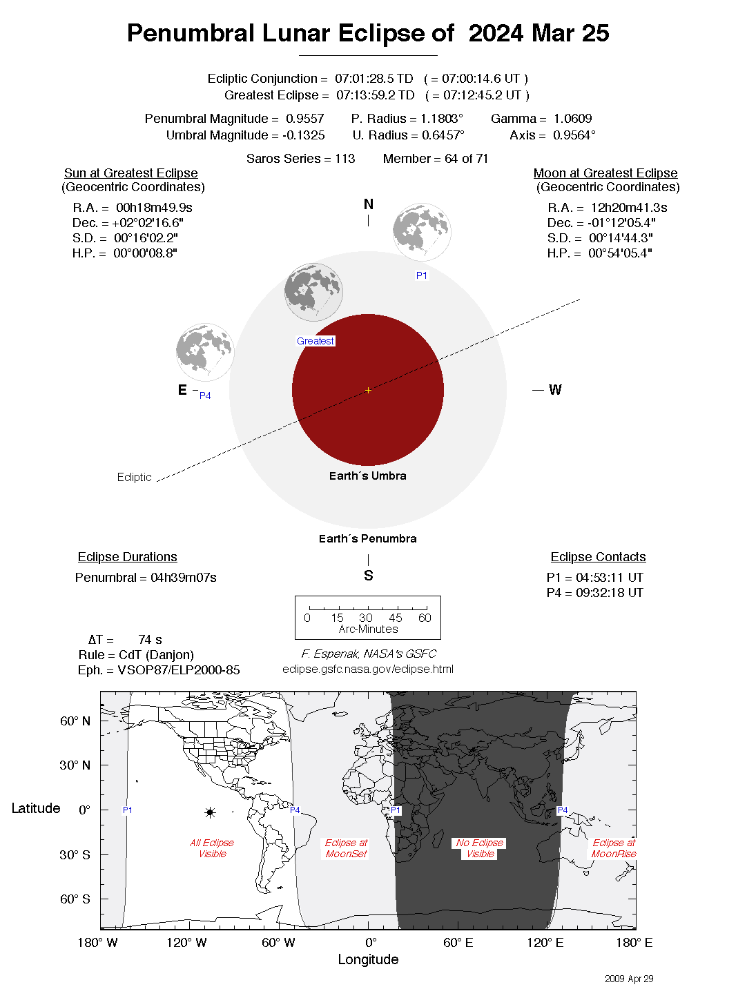 The tables below contain detailed predictions and additional information on the Penumbral Lunar Eclipse of 2024 Mar 25 .