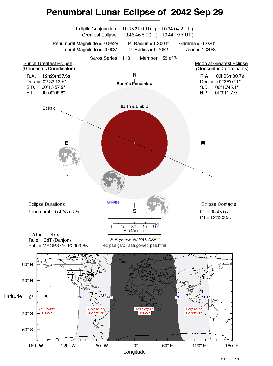 The tables below contain detailed predictions and additional information on the Penumbral Lunar Eclipse of 2042 Sep 29 .