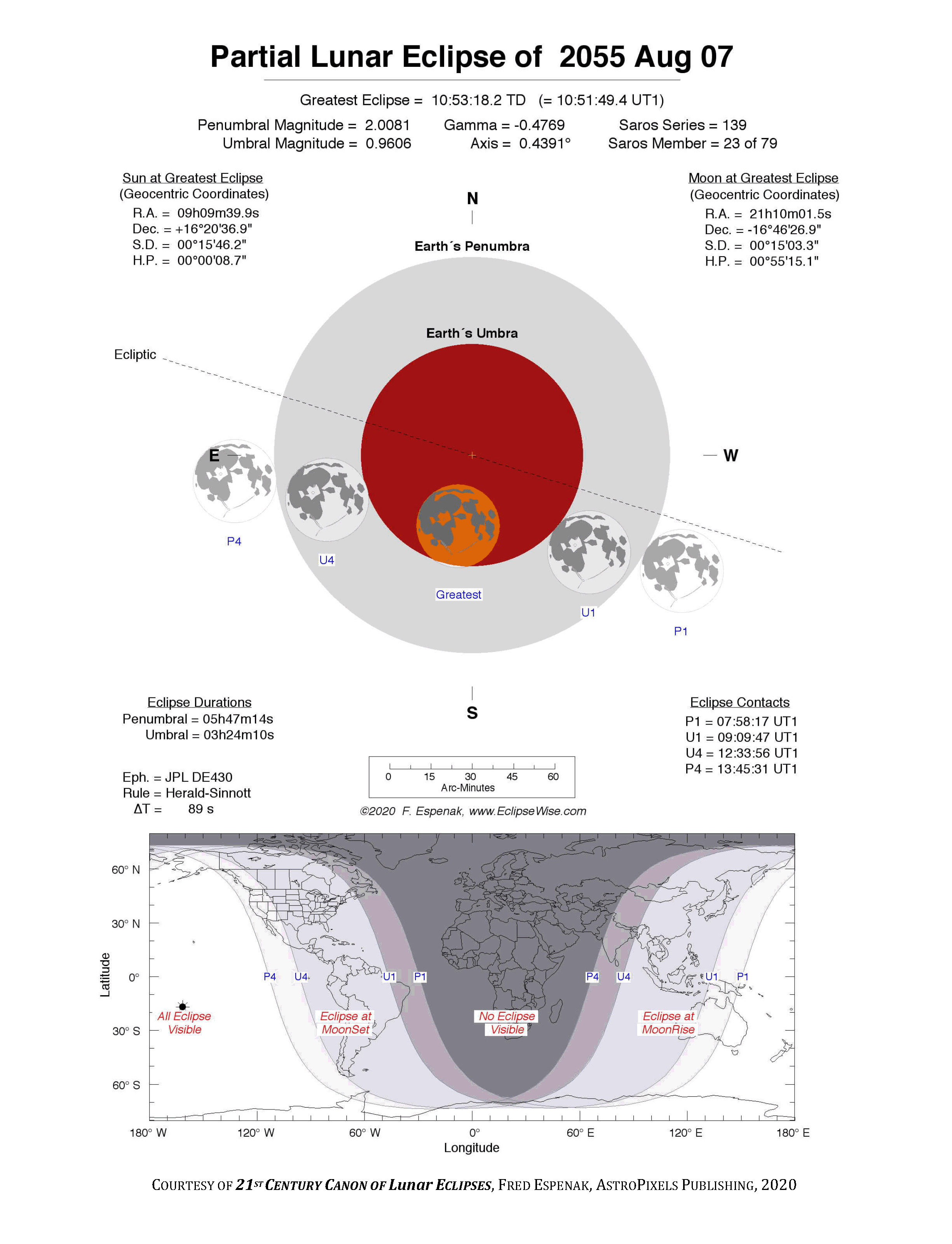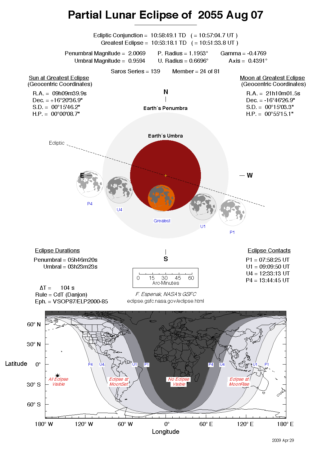 The tables below contain detailed predictions and additional information on the Partial Lunar Eclipse of 2055 Aug 07 .