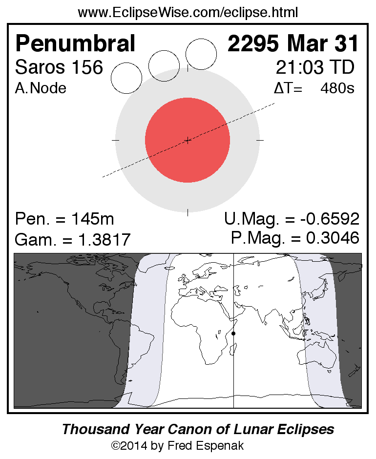 Another lunar eclipse occurs one synodic month before the 2295 Mar 31 eclipse. It is the penumbral lunar eclipse of 2295 Mar 02.