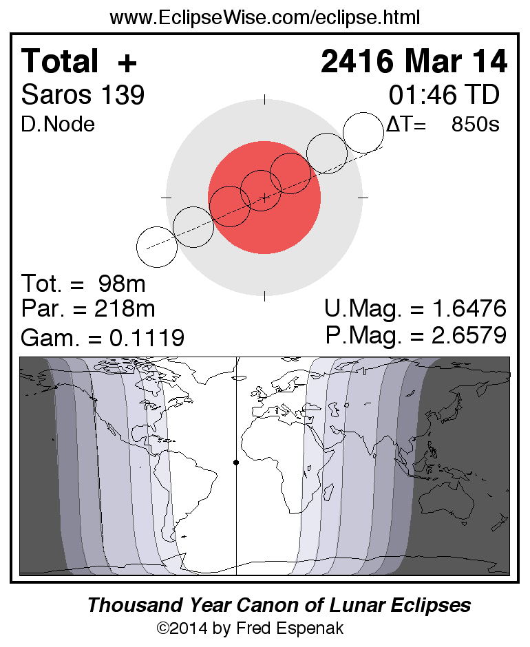 The instant of greatest eclipse takes place on 2416 Mar 14 at 01:45:54 TD (01:31:43 UT1).