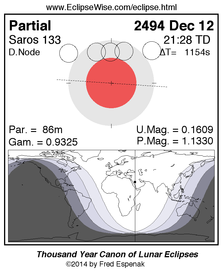 The instant of greatest eclipse takes place on 2494 Dec 12 at 21:27:42 TD (21:08:28 UT1).