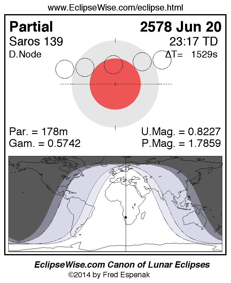 The instant of greatest eclipse takes place on 2578 Jun 20 at 23:17:03 TD (22:51:34 UT1).