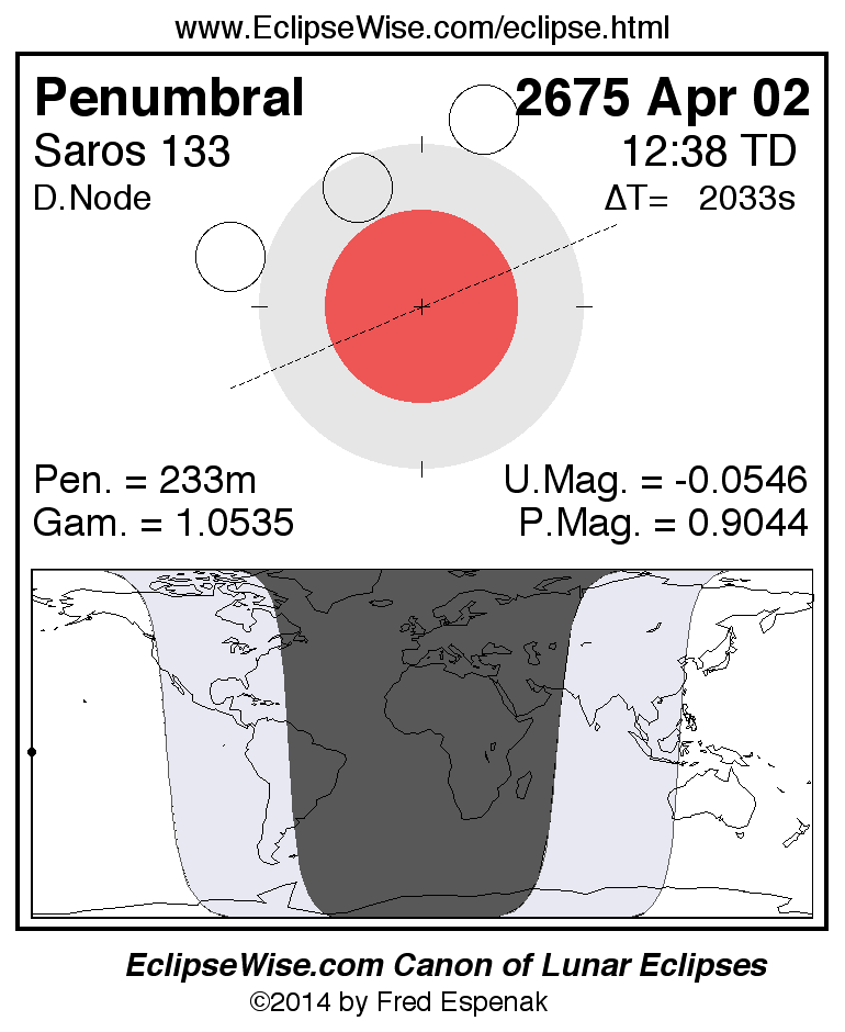 Another lunar eclipse occurs one synodic month after the 2675 Apr 02 eclipse. It is the penumbral lunar eclipse of 2675 May 01.