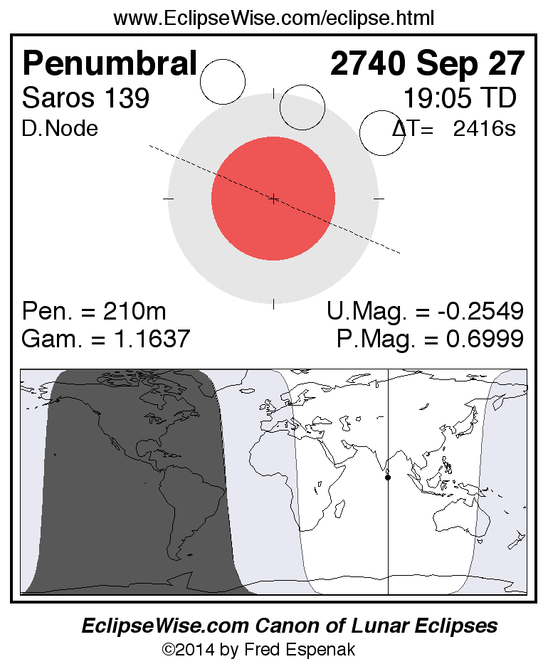 Another lunar eclipse occurs one synodic month after the 2740 Sep 27 eclipse. It is the penumbral lunar eclipse of 2740 Oct 27.