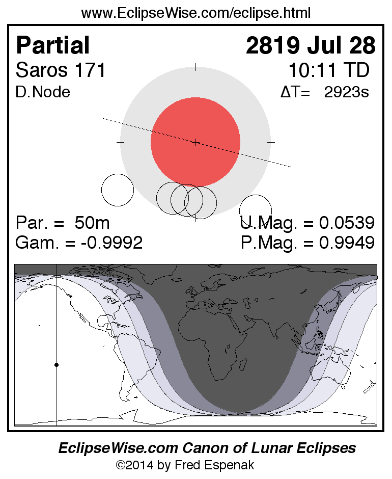 The instant of greatest eclipse takes place on 2819 Jul 28 at 10:10:32 TD (09:21:50 UT1).