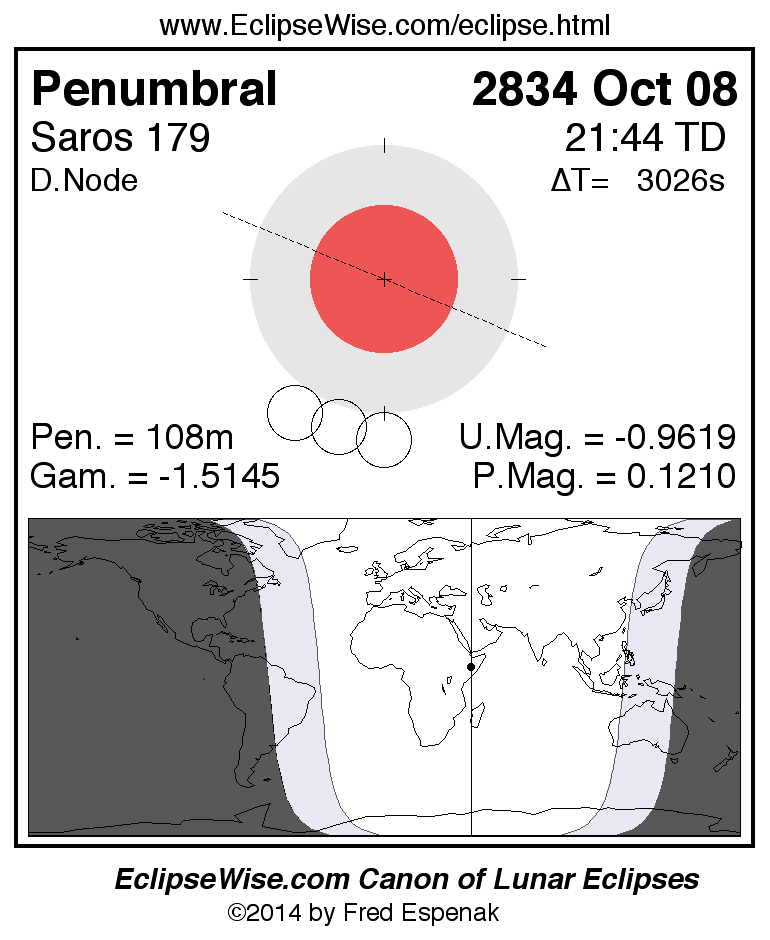 The penumbral lunar eclipse of 2834 Oct 08 is preceded two weeks earlier by a total solar eclipse on 2834 Sep 24.