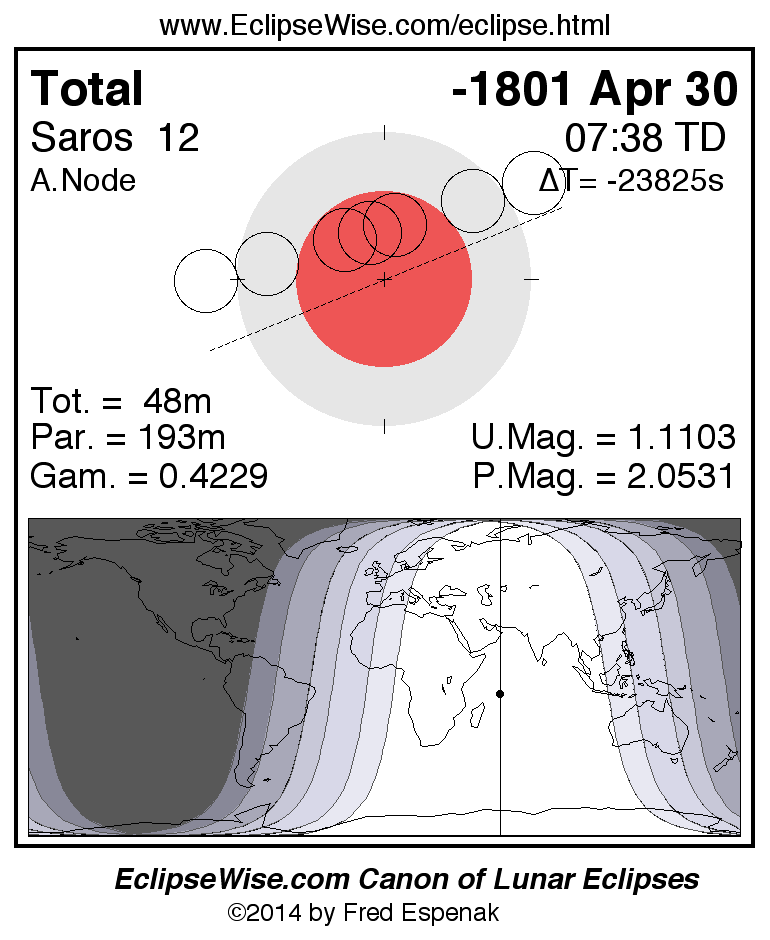 A panorama of all lunar eclipses belonging to Saros 12 is presented here. Each figure shows the Moon's path with respect to Earth's penumbral and umbral shadows. Below the path is a map depicting the geographic region of visibility for the eclipse. The date and time are given for the instant of Greatest Eclipse. Every figure serves as a hyperlink to the EclipseWise Prime page for that eclipse with a larger figure and complete details for the eclipse. Visit the Key to Lunar Eclipse Figures for a detailed explanation of these diagrams. Near the bottom of this page are a series of hyperlinks for more on lunar eclipses.