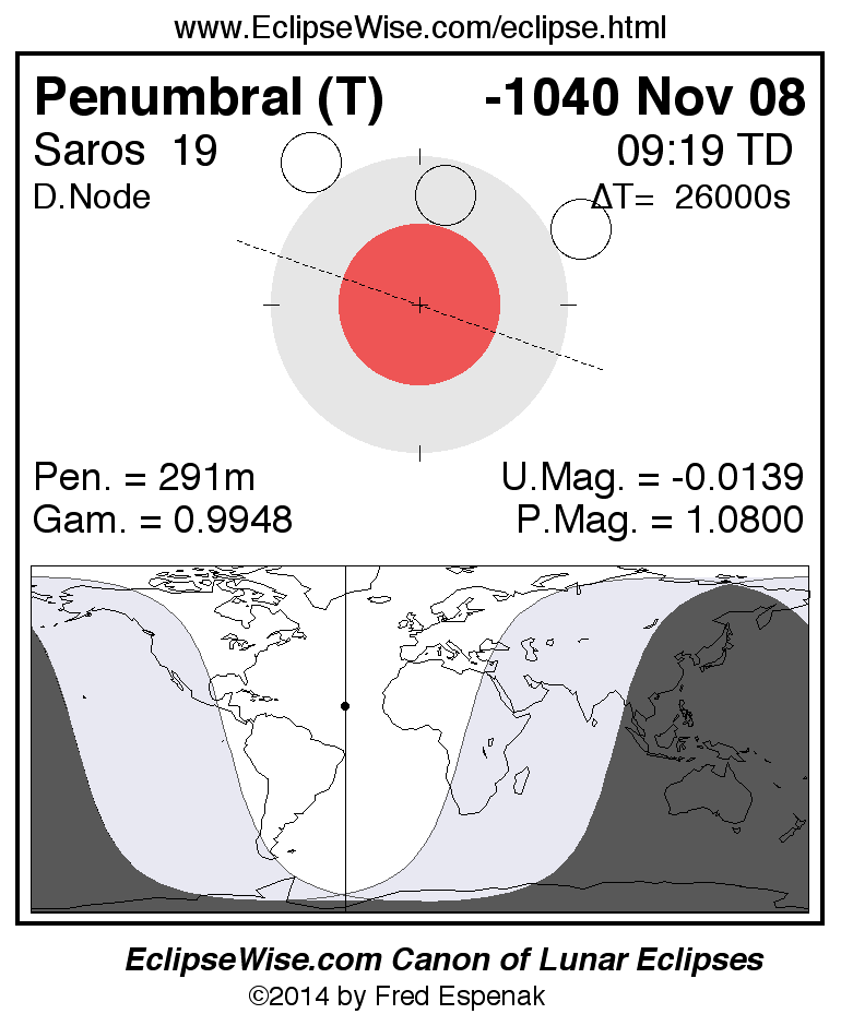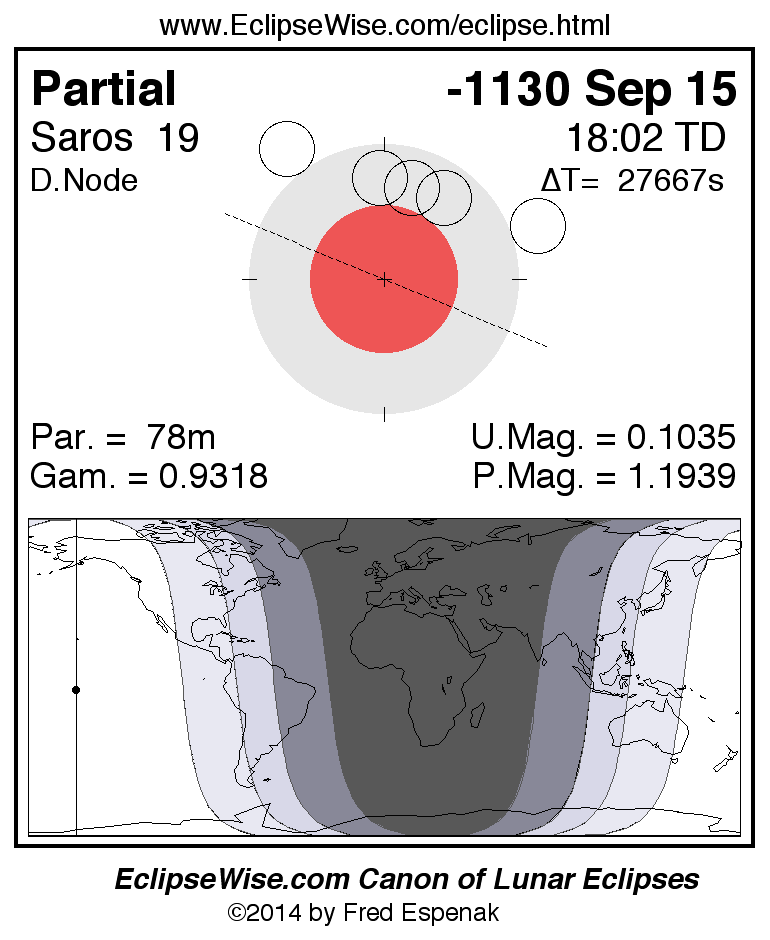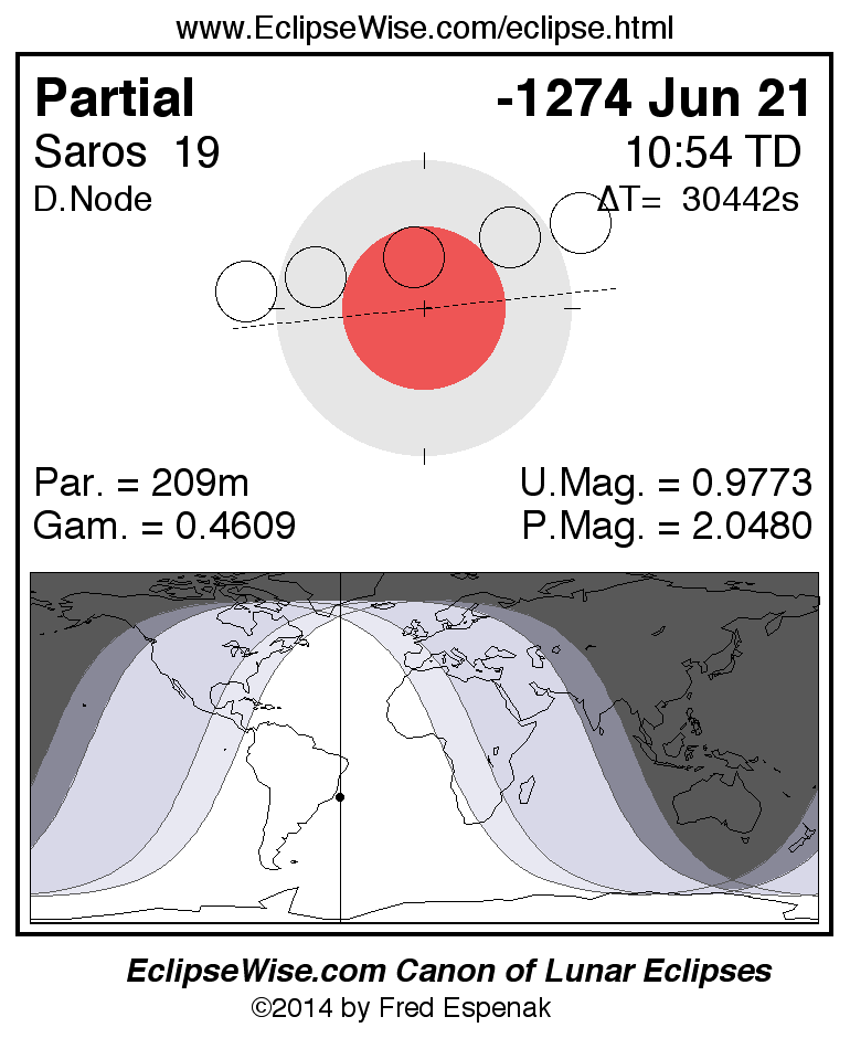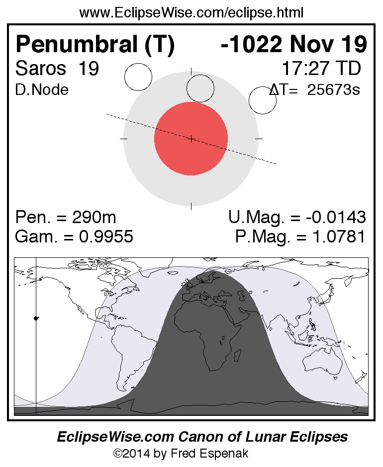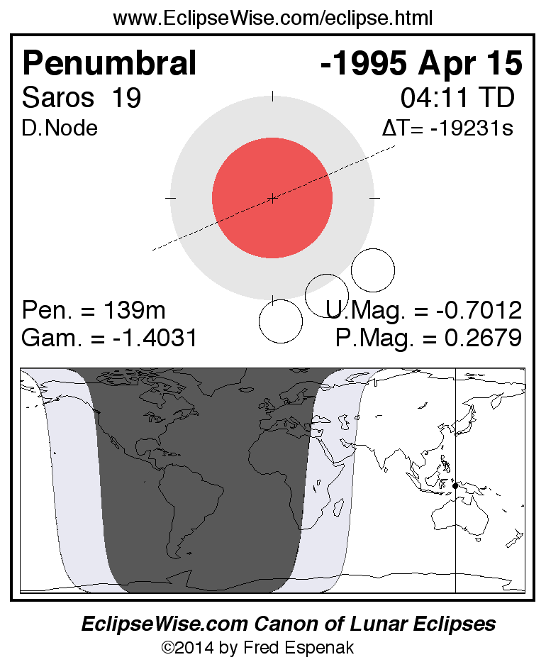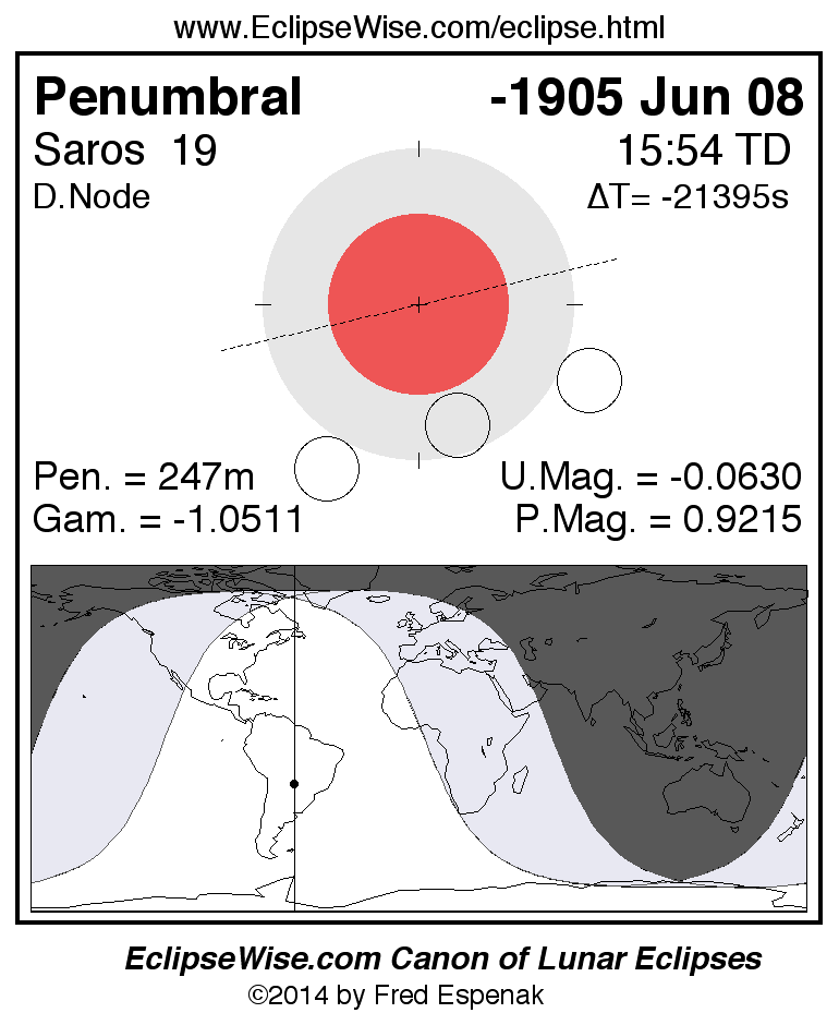 A panorama of all lunar eclipses belonging to Saros 19 is presented here. Each figure shows the Moon's path with respect to Earth's penumbral and umbral shadows. Below the path is a map depicting the geographic region of visibility for the eclipse. The date and time are given for the instant of Greatest Eclipse. Every figure serves as a hyperlink to the EclipseWise Prime page for that eclipse with a larger figure and complete details for the eclipse. Visit the Key to Lunar Eclipse Figures for a detailed explanation of these diagrams. Near the bottom of this page are a series of hyperlinks for more on lunar eclipses.