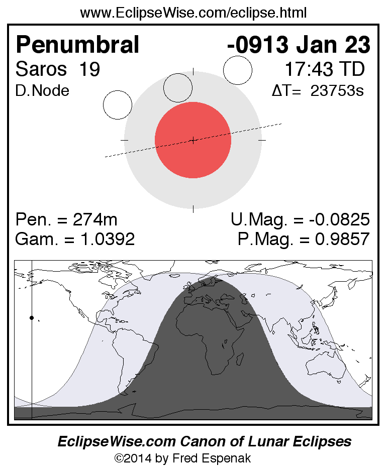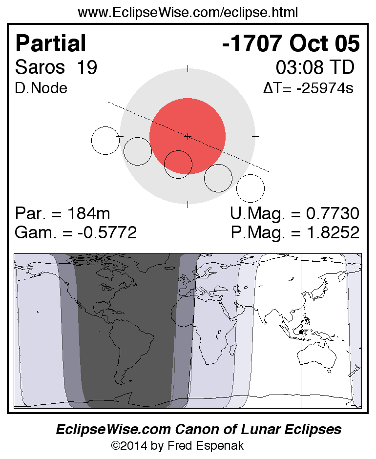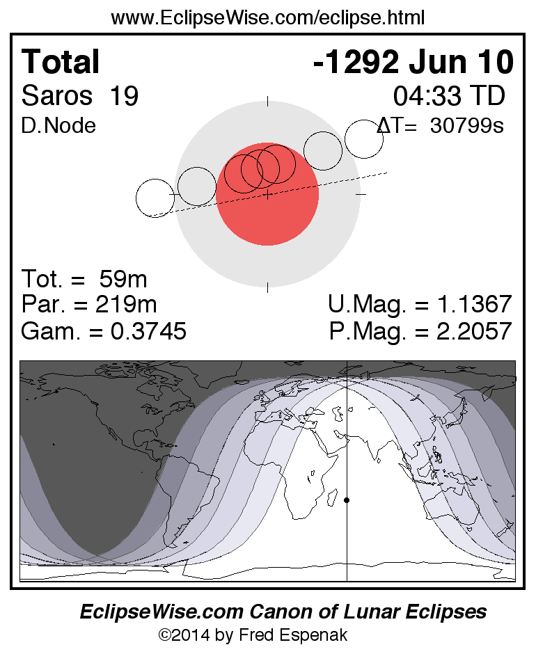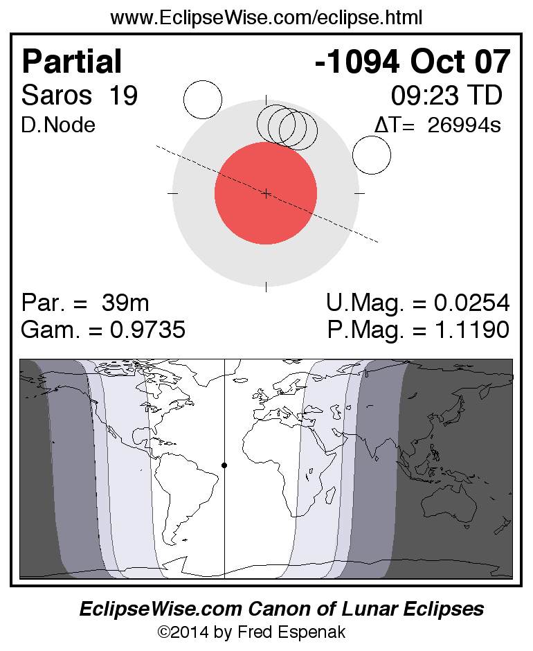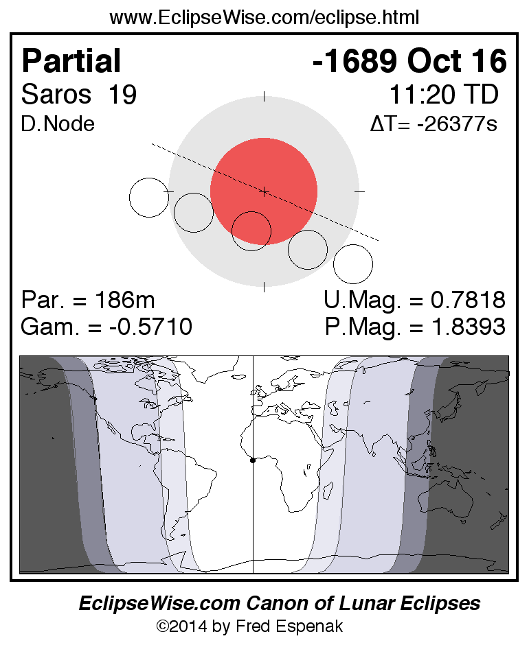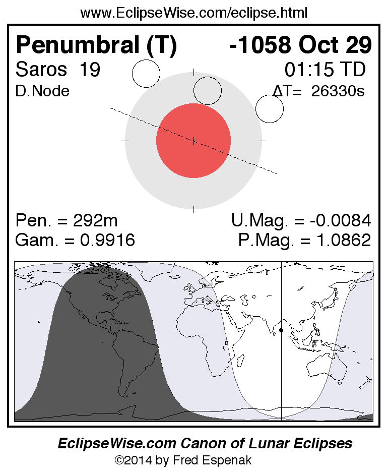A panorama of all lunar eclipses belonging to Saros 19 is presented here. Each figure shows the Moon's path with respect to Earth's penumbral and umbral shadows. Below the path is a map depicting the geographic region of visibility for the eclipse. The date and time are given for the instant of Greatest Eclipse. Every figure serves as a hyperlink to the EclipseWise Prime page for that eclipse with a larger figure and complete details for the eclipse. Visit the Key to Lunar Eclipse Figures for a detailed explanation of these diagrams. Near the bottom of this page are a series of hyperlinks for more on lunar eclipses.