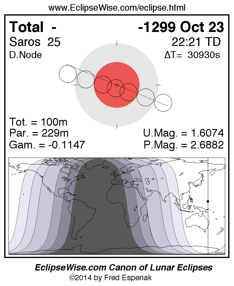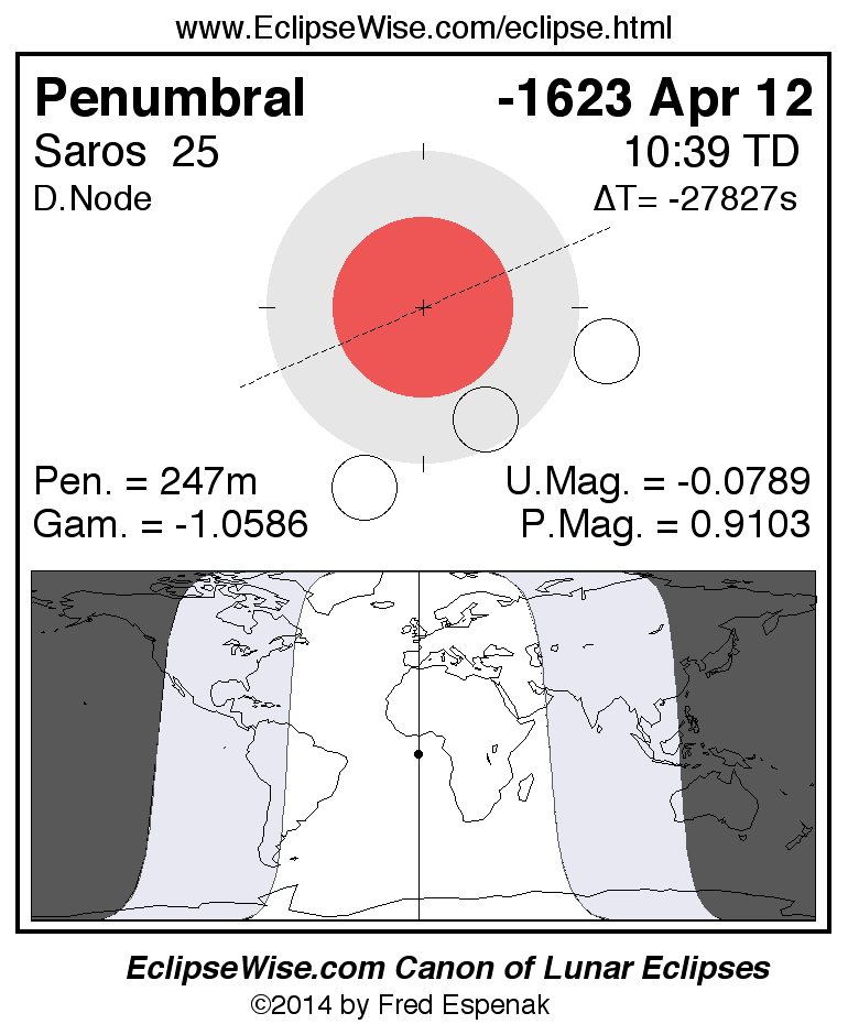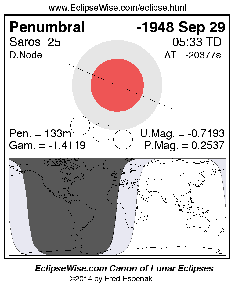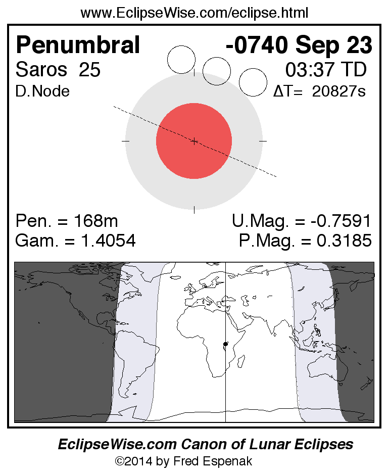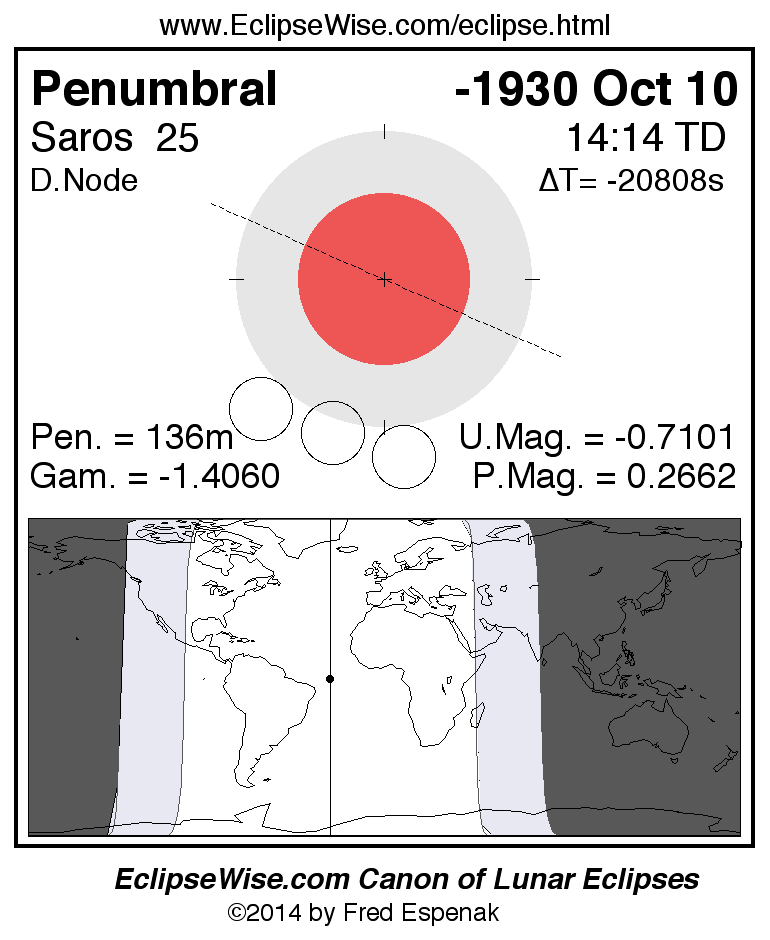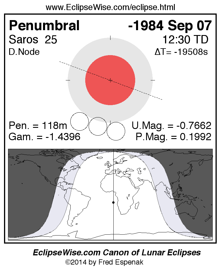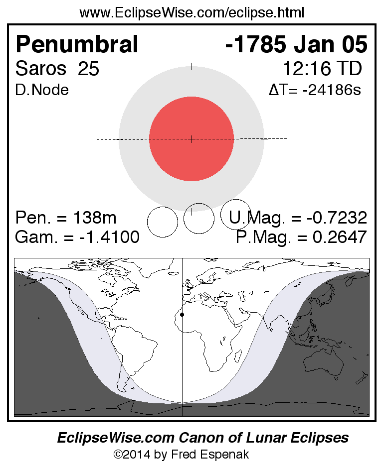 A panorama of all lunar eclipses belonging to Saros 25 is presented here. Each figure shows the Moon's path with respect to Earth's penumbral and umbral shadows. Below the path is a map depicting the geographic region of visibility for the eclipse. The date and time are given for the instant of Greatest Eclipse. Every figure serves as a hyperlink to the EclipseWise Prime page for that eclipse with a larger figure and complete details for the eclipse. Visit the Key to Lunar Eclipse Figures for a detailed explanation of these diagrams. Near the bottom of this page are a series of hyperlinks for more on lunar eclipses.