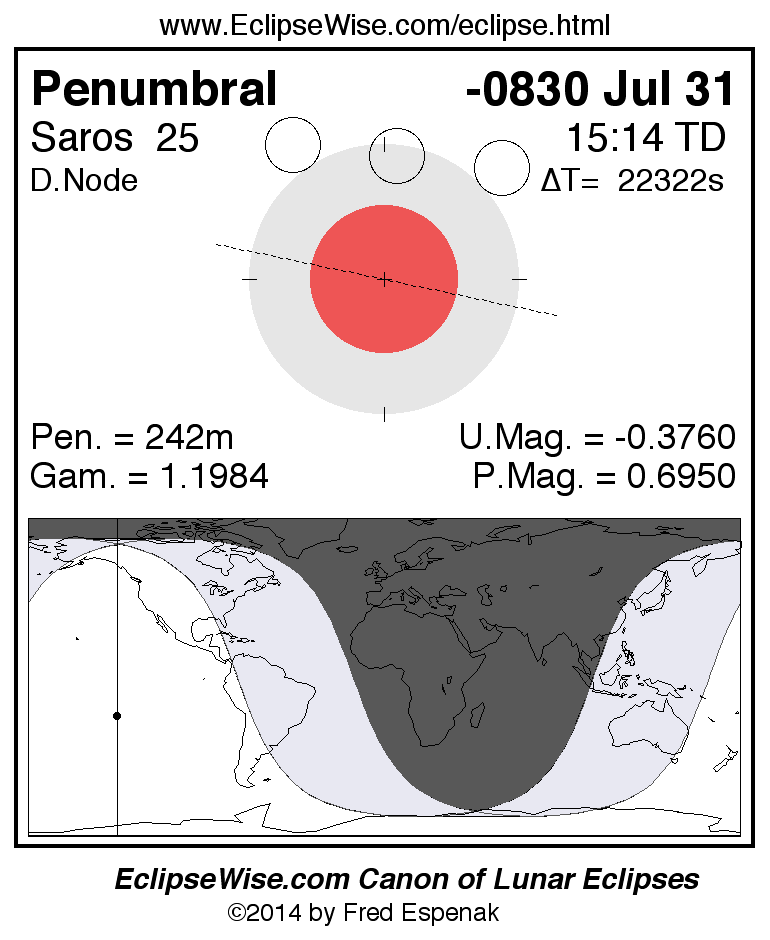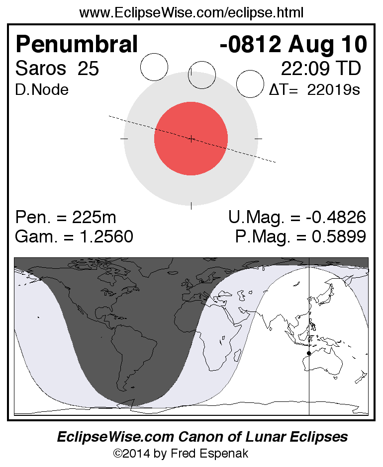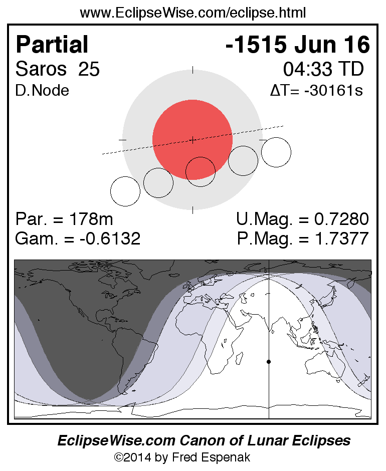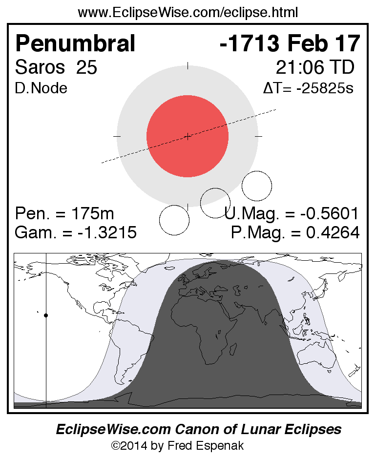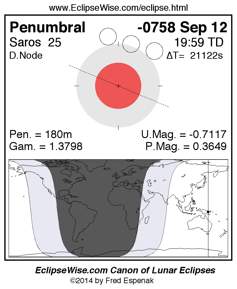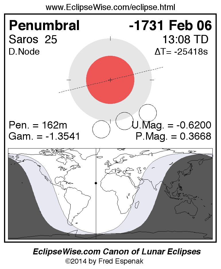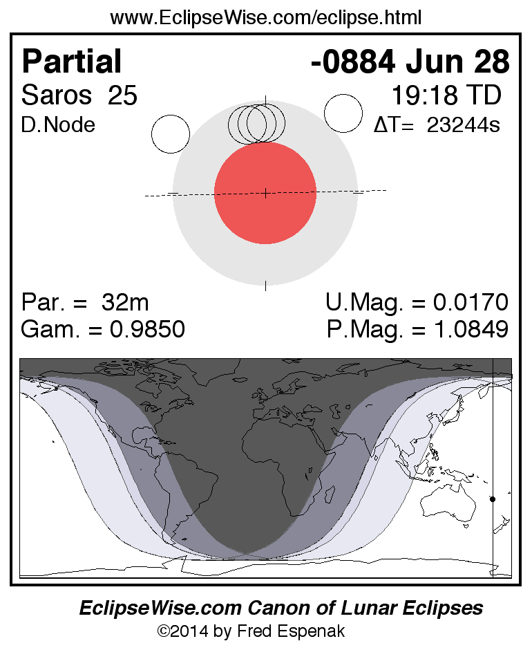 A panorama of all lunar eclipses belonging to Saros 25 is presented here. Each figure shows the Moon's path with respect to Earth's penumbral and umbral shadows. Below the path is a map depicting the geographic region of visibility for the eclipse. The date and time are given for the instant of Greatest Eclipse. Every figure serves as a hyperlink to the EclipseWise Prime page for that eclipse with a larger figure and complete details for the eclipse. Visit the Key to Lunar Eclipse Figures for a detailed explanation of these diagrams. Near the bottom of this page are a series of hyperlinks for more on lunar eclipses.