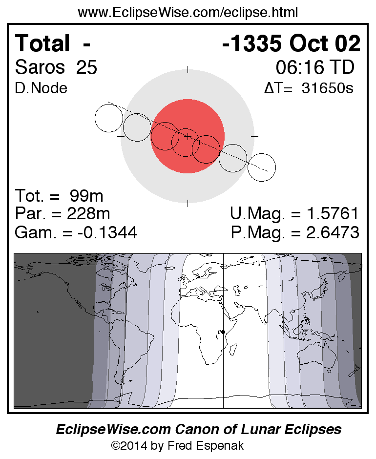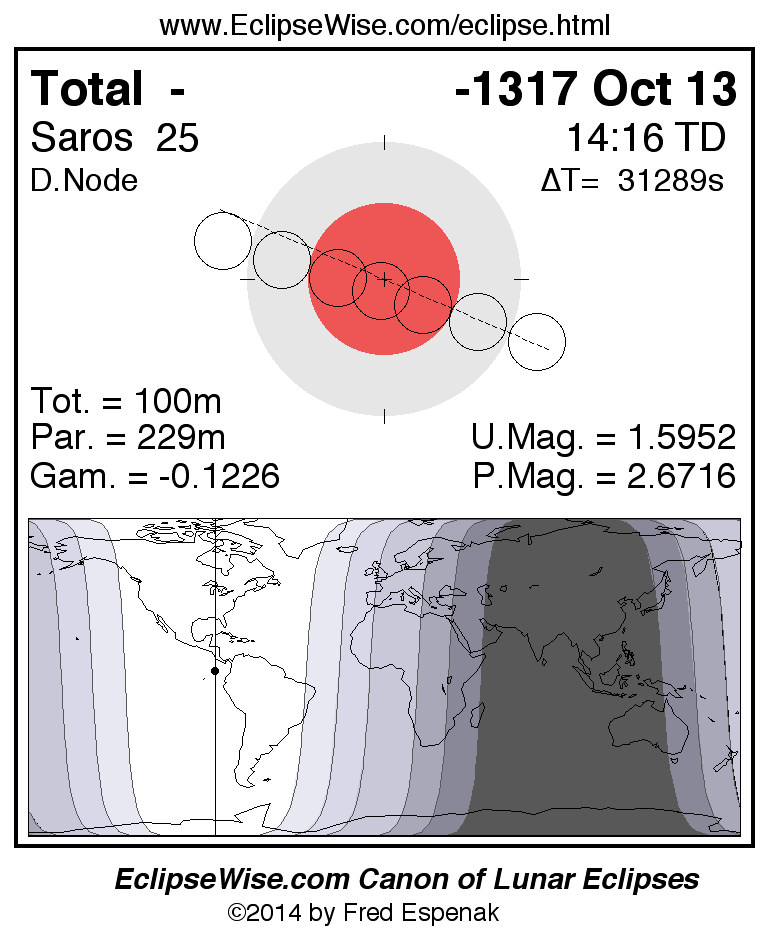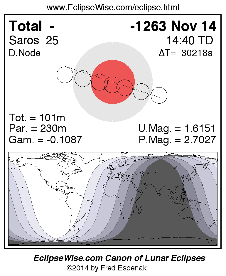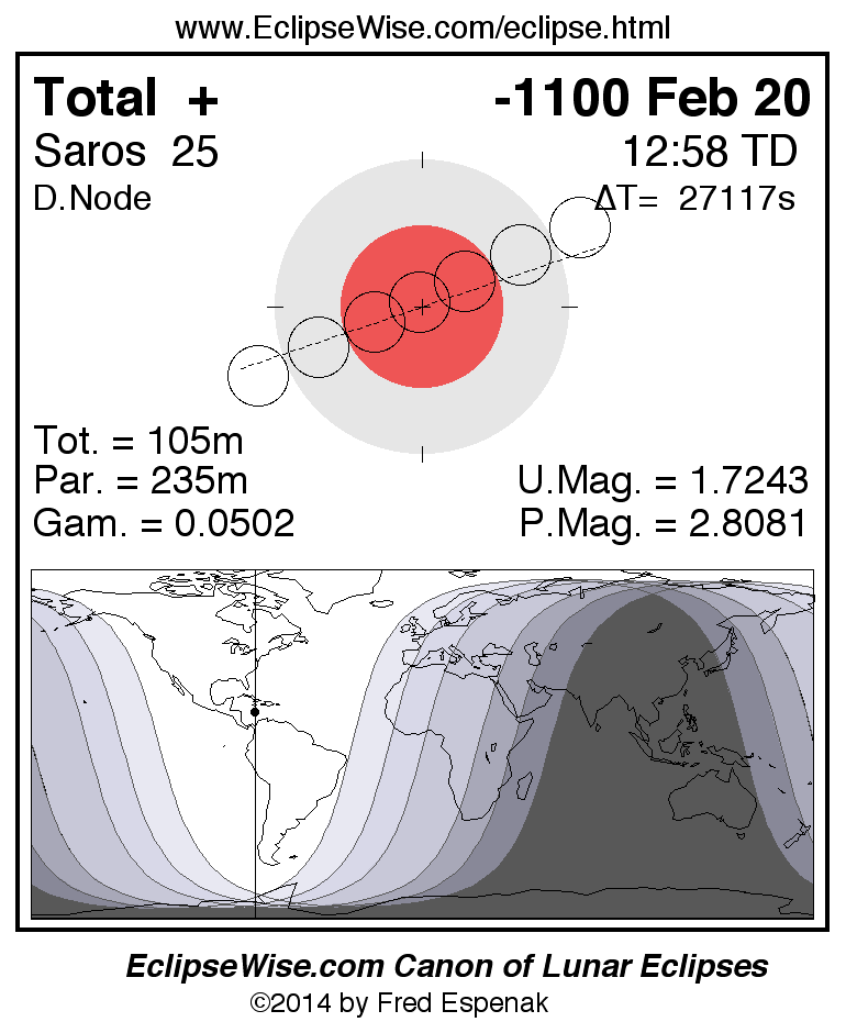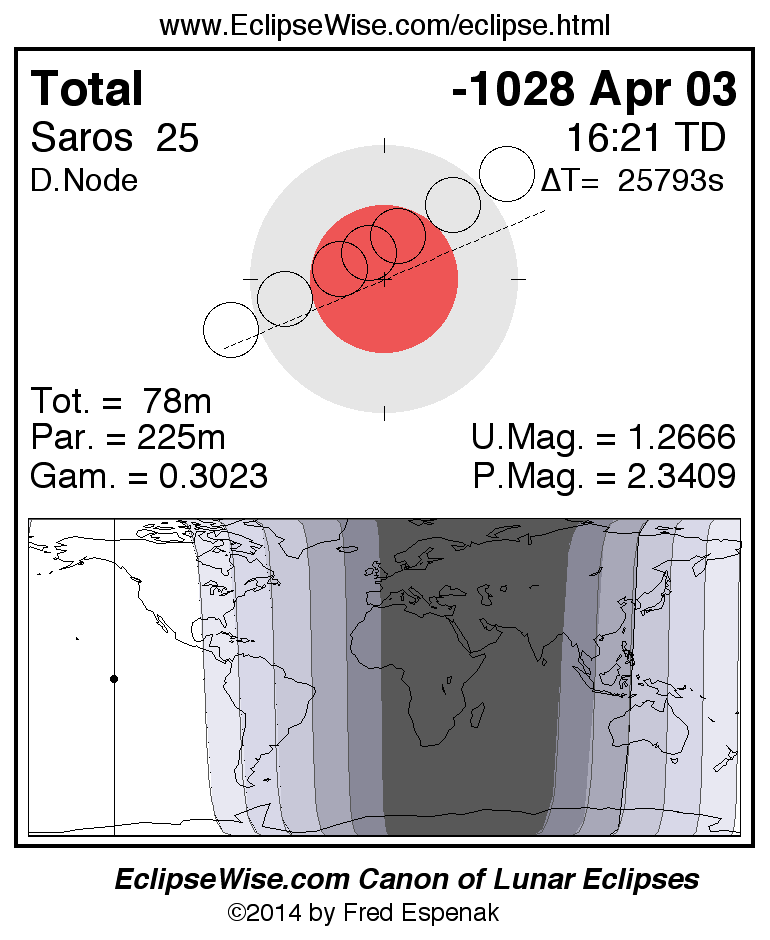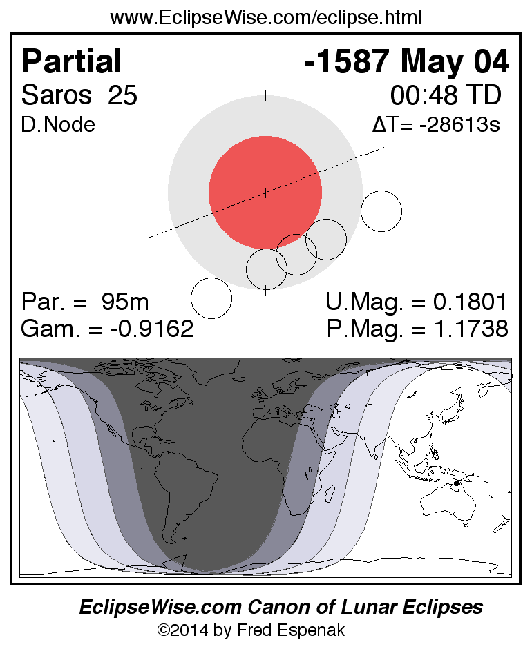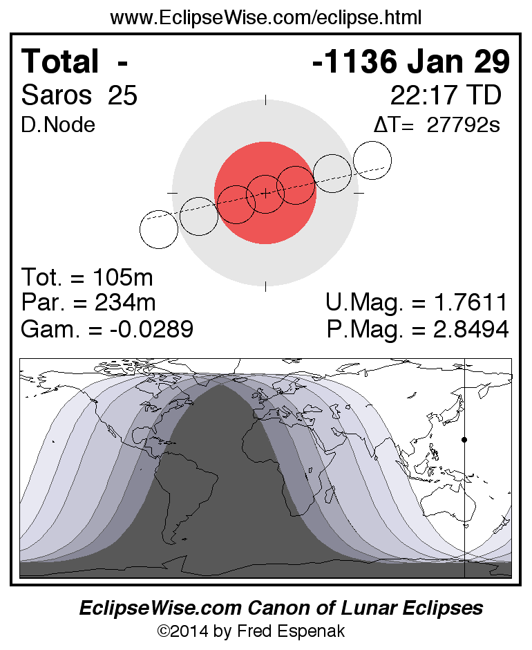 A panorama of all lunar eclipses belonging to Saros 25 is presented here. Each figure shows the Moon's path with respect to Earth's penumbral and umbral shadows. Below the path is a map depicting the geographic region of visibility for the eclipse. The date and time are given for the instant of Greatest Eclipse. Every figure serves as a hyperlink to the EclipseWise Prime page for that eclipse with a larger figure and complete details for the eclipse. Visit the Key to Lunar Eclipse Figures for a detailed explanation of these diagrams. Near the bottom of this page are a series of hyperlinks for more on lunar eclipses.