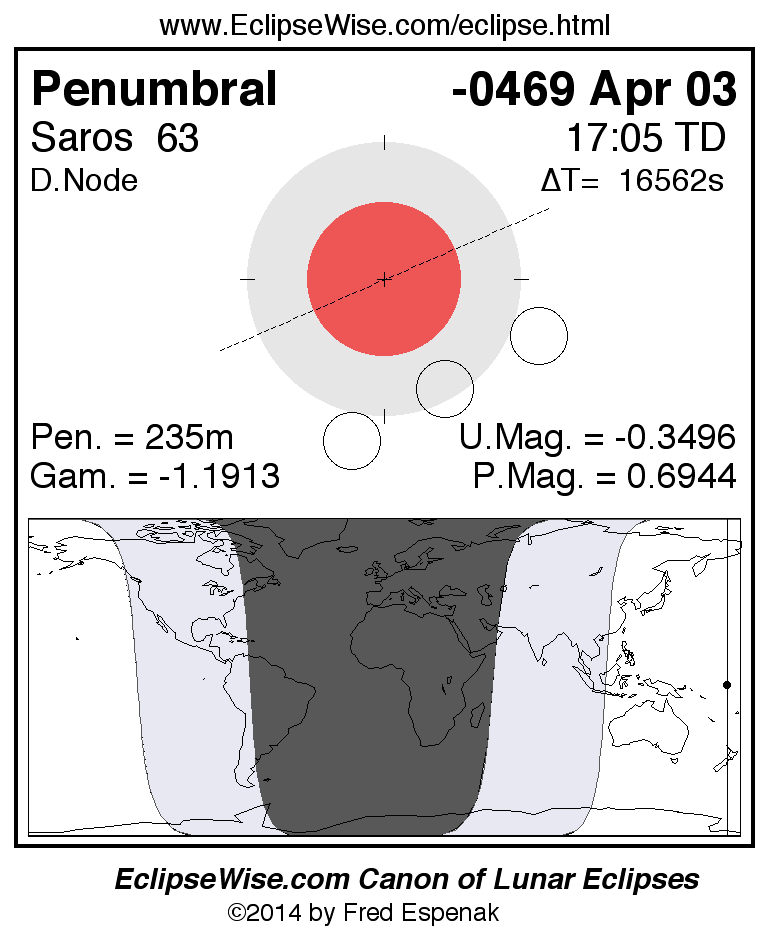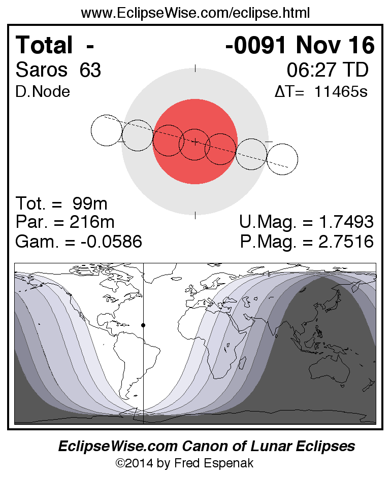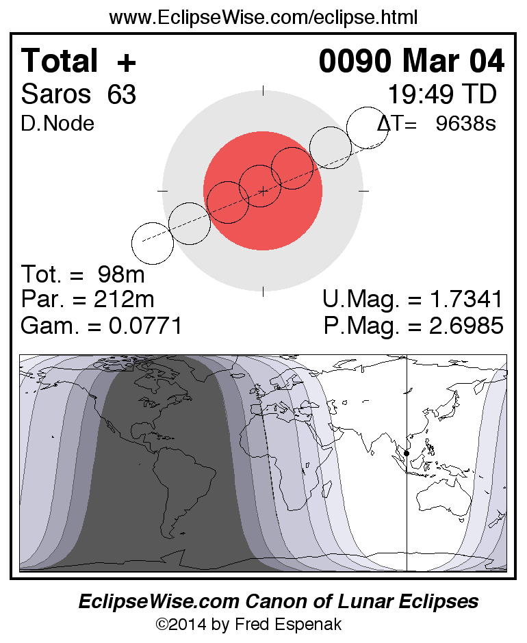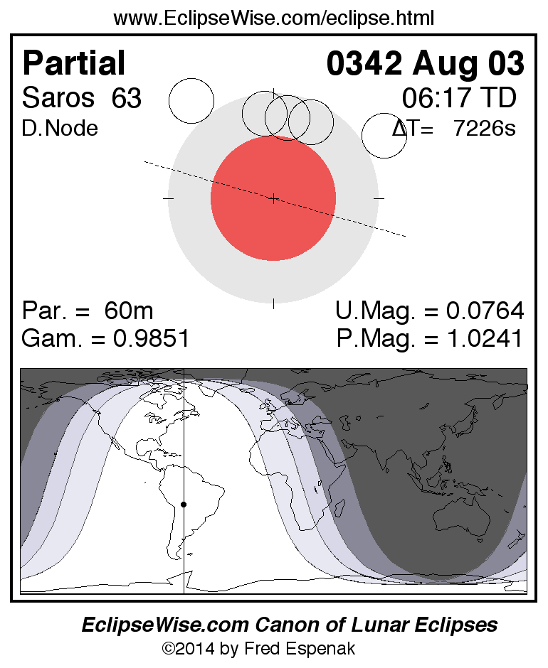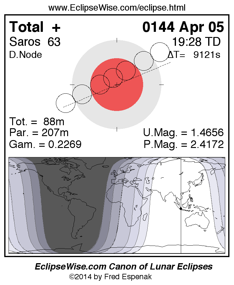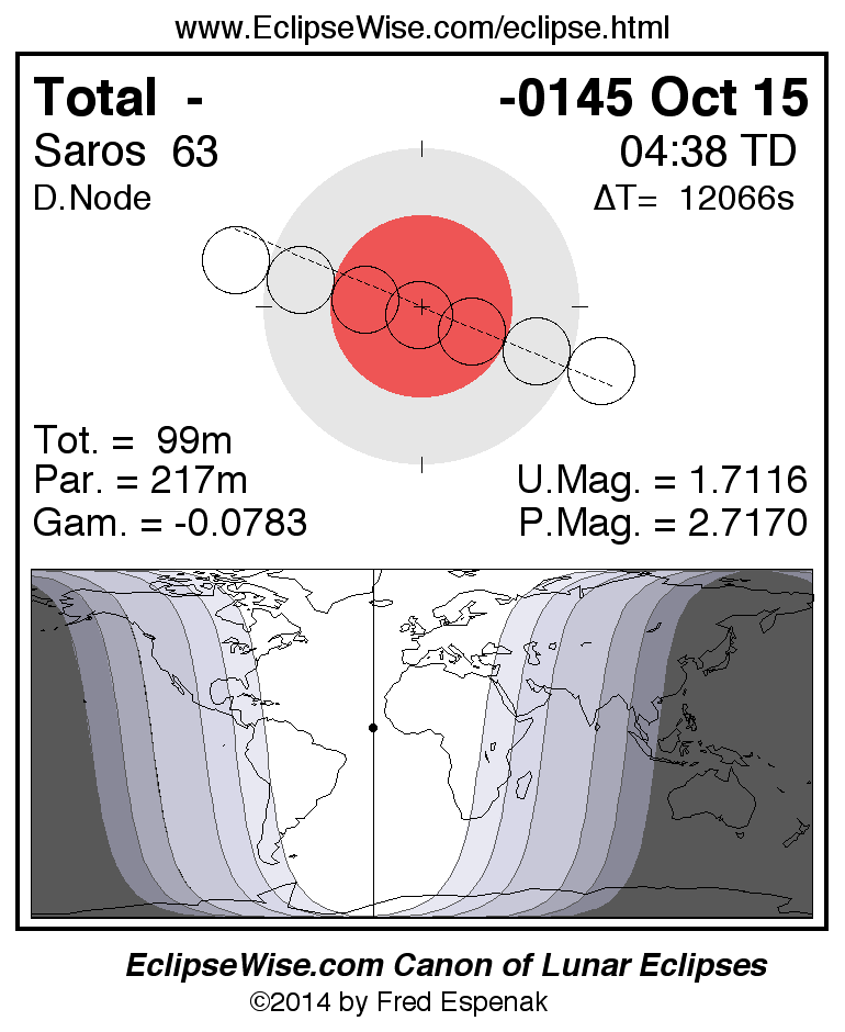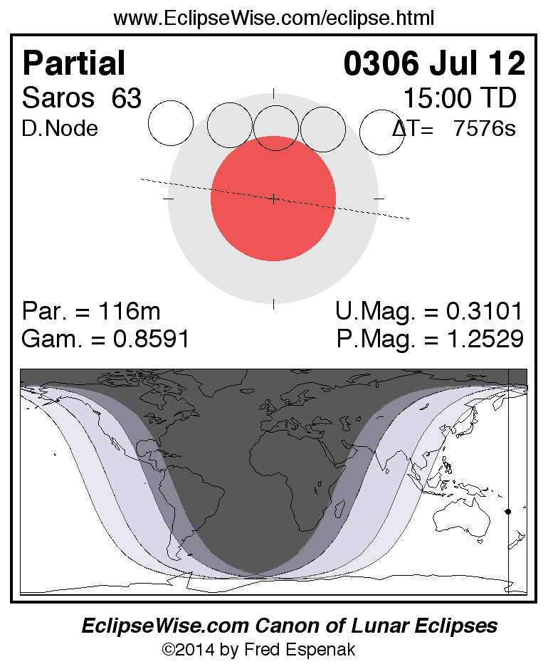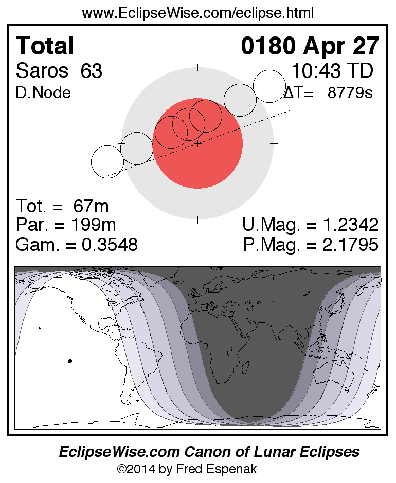 A panorama of all lunar eclipses belonging to Saros 63 is presented here. Each figure shows the Moon's path with respect to Earth's penumbral and umbral shadows. Below the path is a map depicting the geographic region of visibility for the eclipse. The date and time are given for the instant of Greatest Eclipse. Every figure serves as a hyperlink to the EclipseWise Prime page for that eclipse with a larger figure and complete details for the eclipse. Visit the Key to Lunar Eclipse Figures for a detailed explanation of these diagrams. Near the bottom of this page are a series of hyperlinks for more on lunar eclipses.