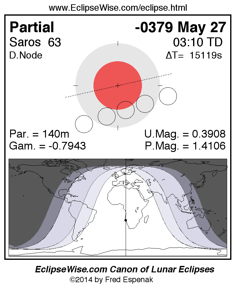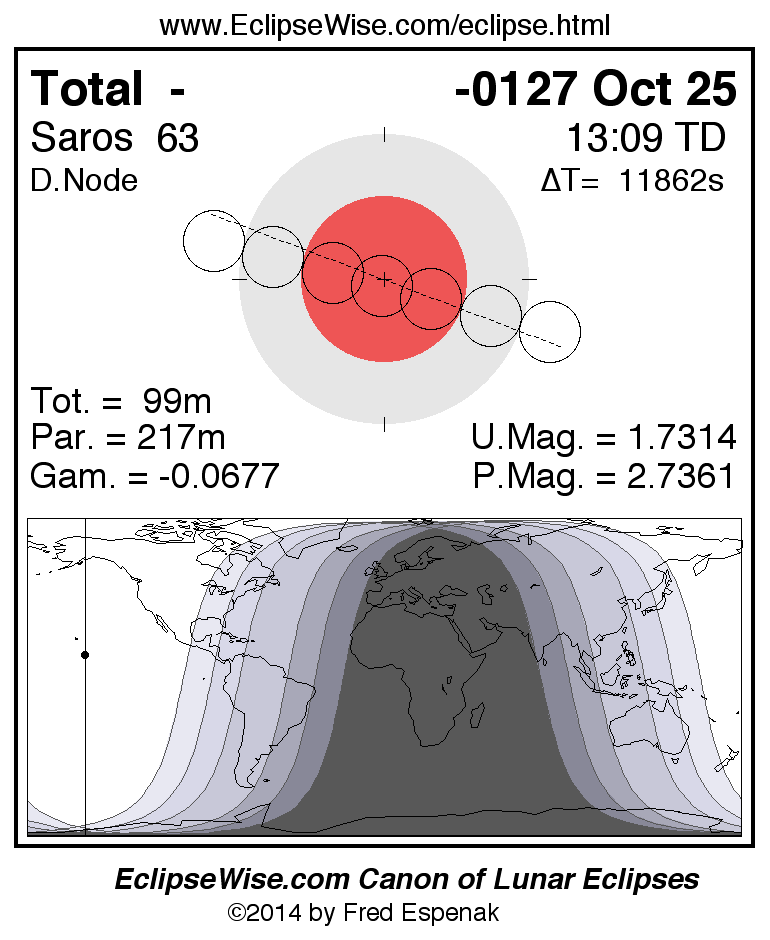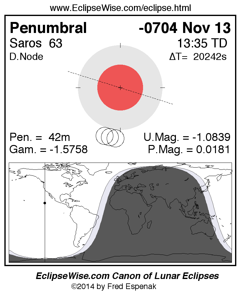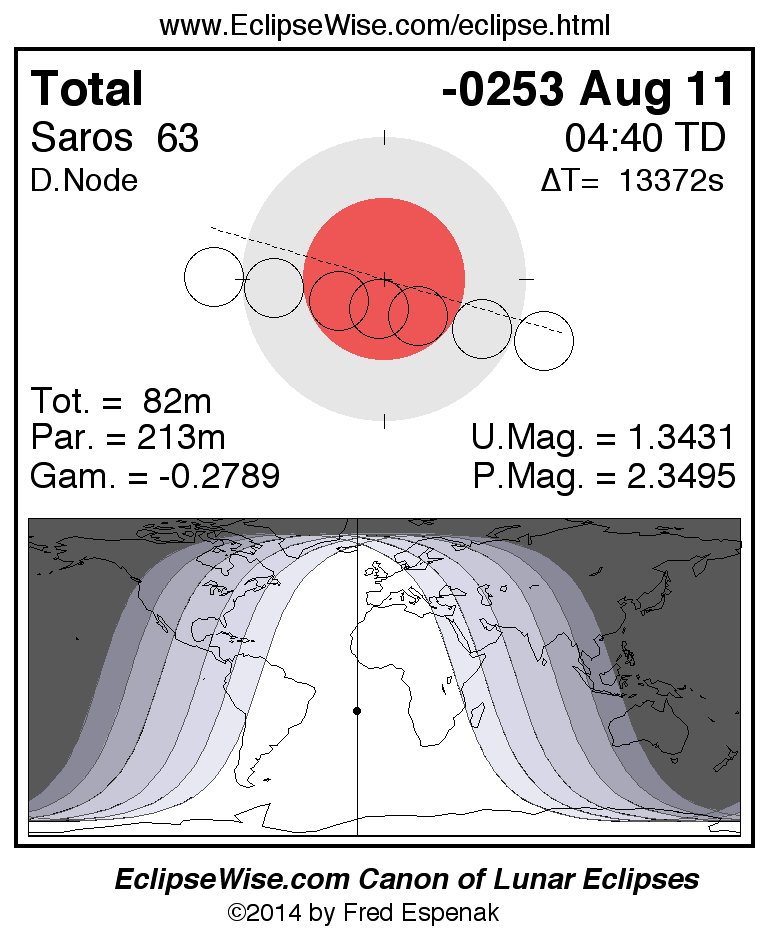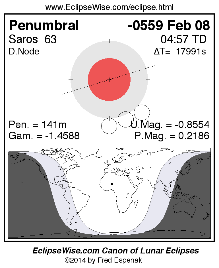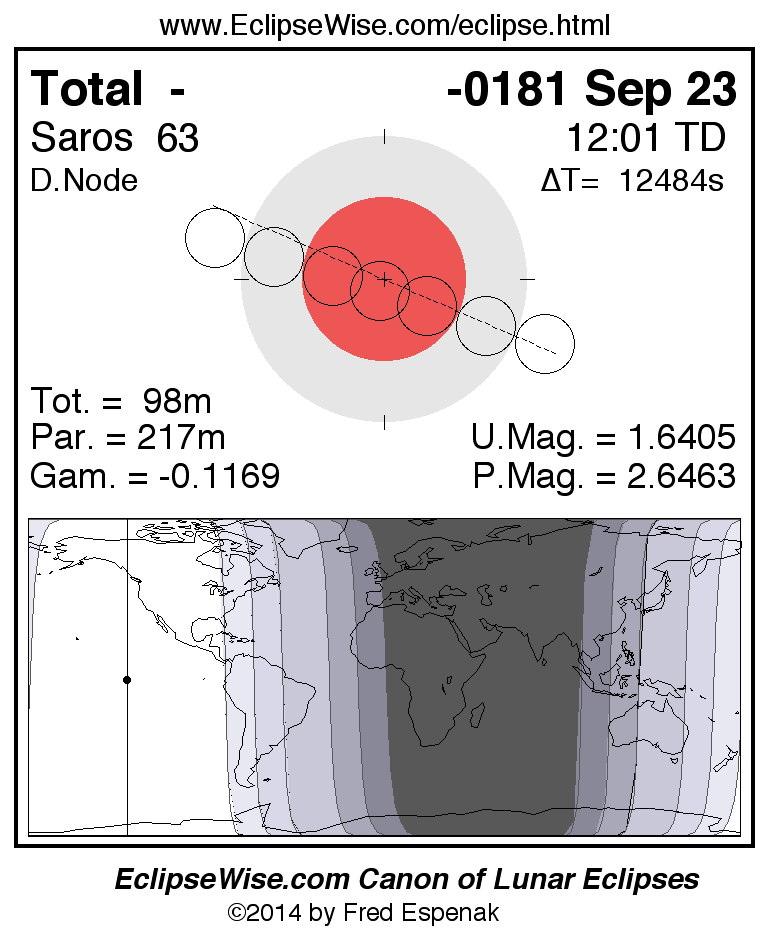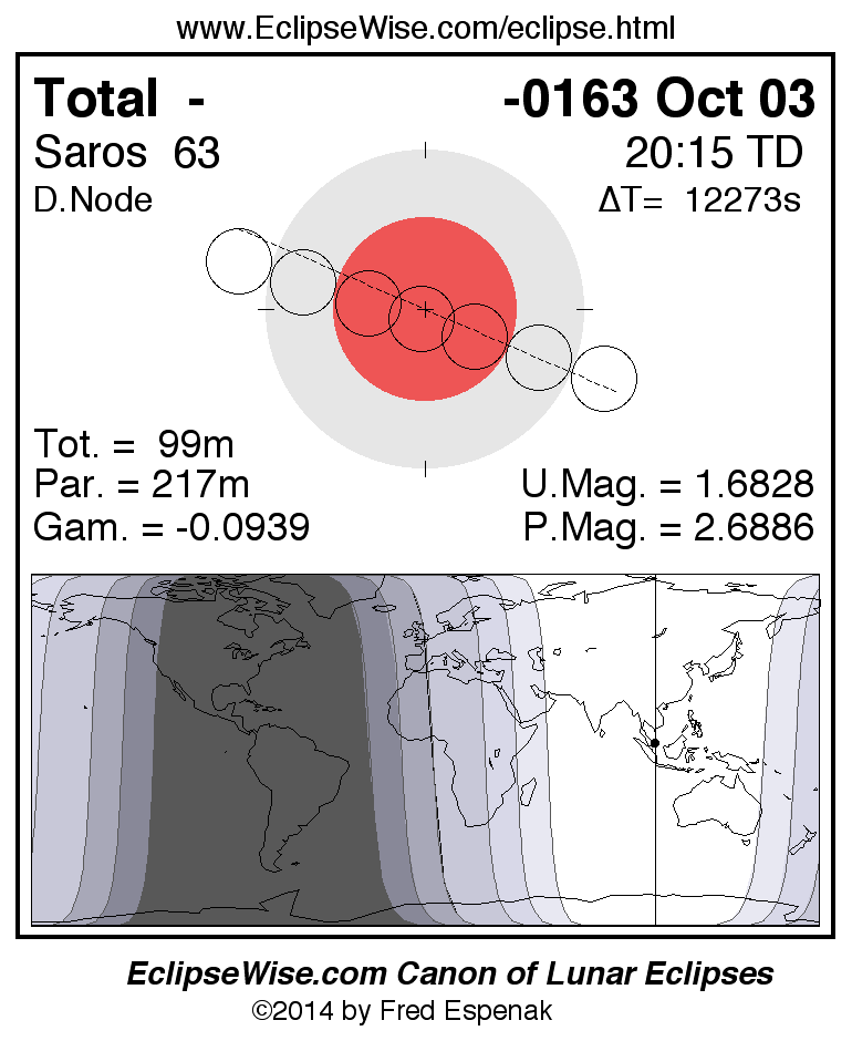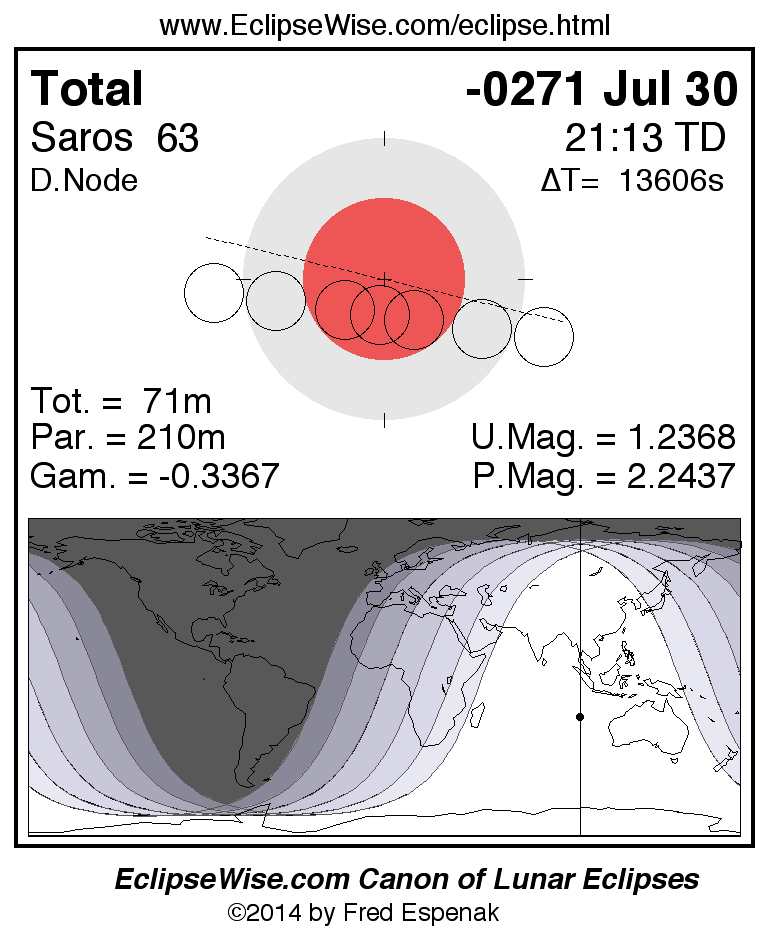 A panorama of all lunar eclipses belonging to Saros 63 is presented here. Each figure shows the Moon's path with respect to Earth's penumbral and umbral shadows. Below the path is a map depicting the geographic region of visibility for the eclipse. The date and time are given for the instant of Greatest Eclipse. Every figure serves as a hyperlink to the EclipseWise Prime page for that eclipse with a larger figure and complete details for the eclipse. Visit the Key to Lunar Eclipse Figures for a detailed explanation of these diagrams. Near the bottom of this page are a series of hyperlinks for more on lunar eclipses.