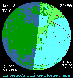 This page features an interactive Google map [1] showing the regional visibility of the Total Solar Eclipse of 1997 Mar 09. The Google map allows the user to zoom and scroll the map as desired. Clicking the cursor on any location will immediately generate a prediction of the eclipse circumstances from that location. The small global map to the right is for reference and illustrates the overall visibility of the eclipse (for an explanation of this map's features, see Key to Solar Eclipse Maps).