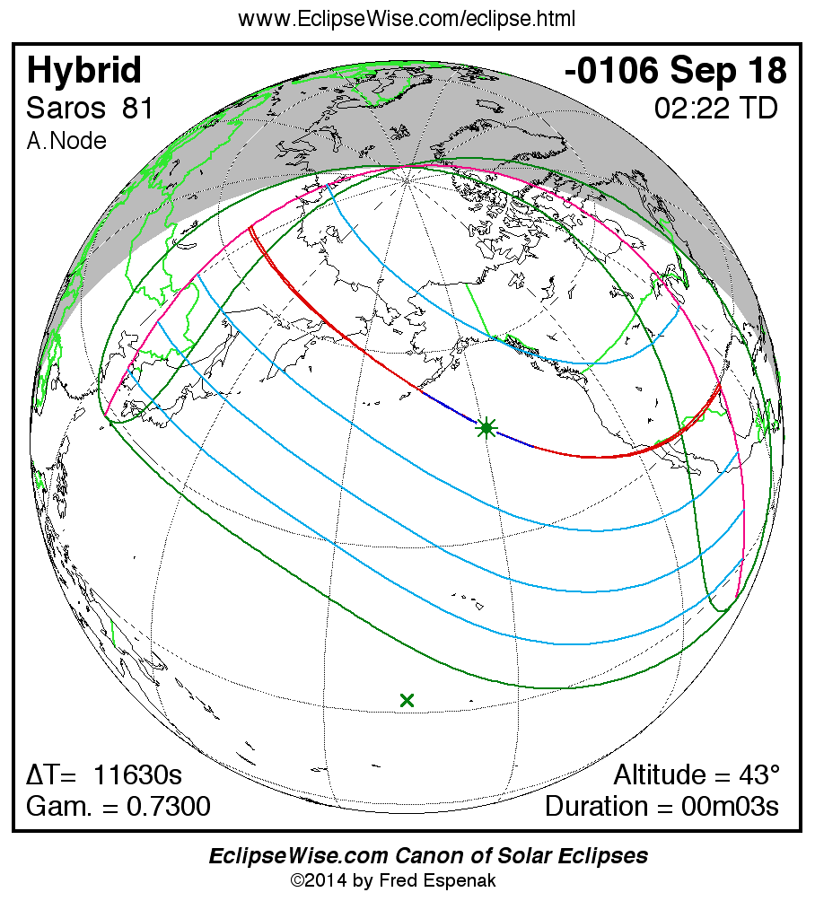 The solar eclipse of -0106 Sep 19 is one of the rare hybrid solar eclipses. In this particular case the eclipse path starts out as annular. Further down the track it changes to total and then back to annular before the path ends. It is a very short hybrid eclipse with a duration at greatest eclipse of 00m03s. The eclipse magnitude is 1.0006, while Gamma has a value of 0.7299.