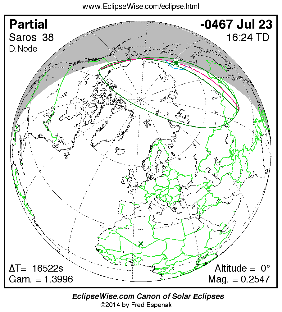 The instant of greatest eclipse takes place on -0467 Jul 23 at 16:24:07 TD (11:48:46 UT1).