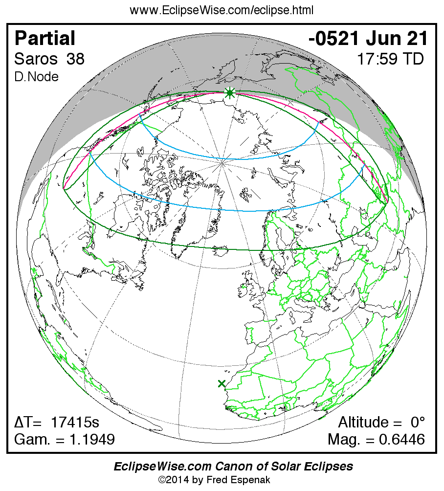 The instant of greatest eclipse takes place on -0521 Jun 21 at 17:58:34 TD (13:08:21 UT1).