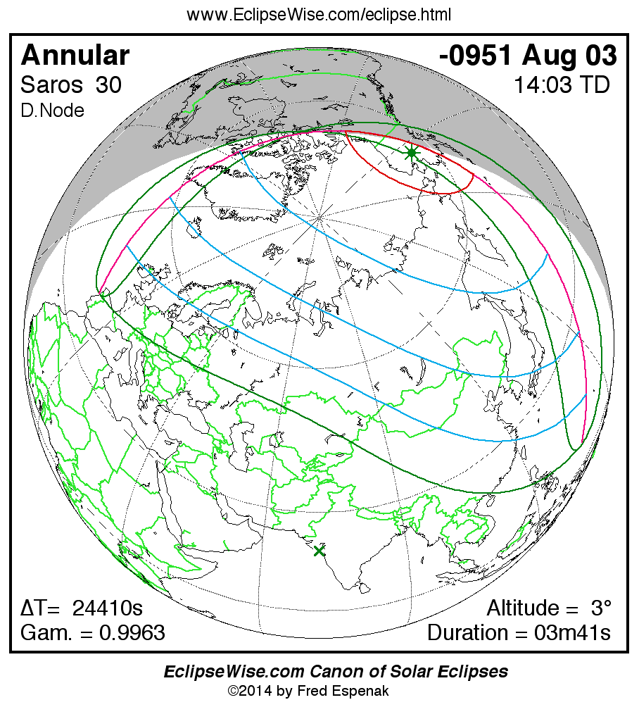 - Path Table: Annular Solar Eclipse of -0951 Aug 03 - coordinates of the central line and path limits