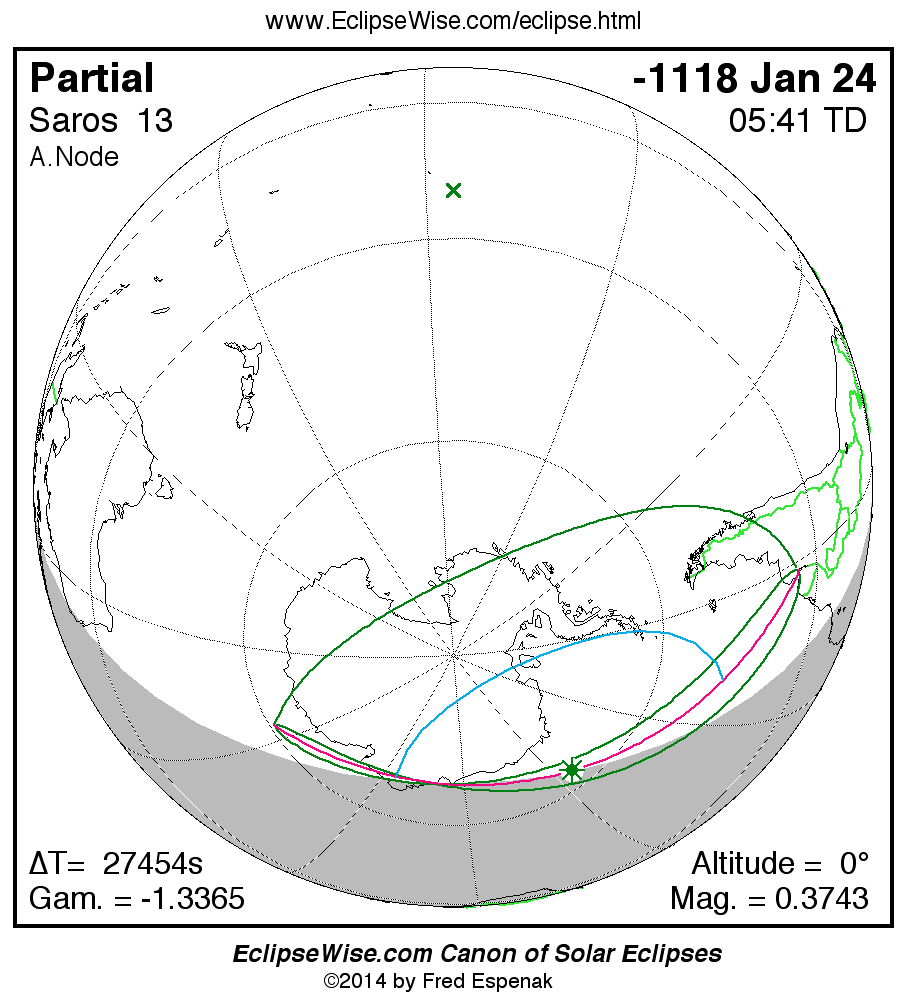 The instant of greatest eclipse takes place on -1118 Jan 25 at 05:41:28 TD (22:03:57 UT1).