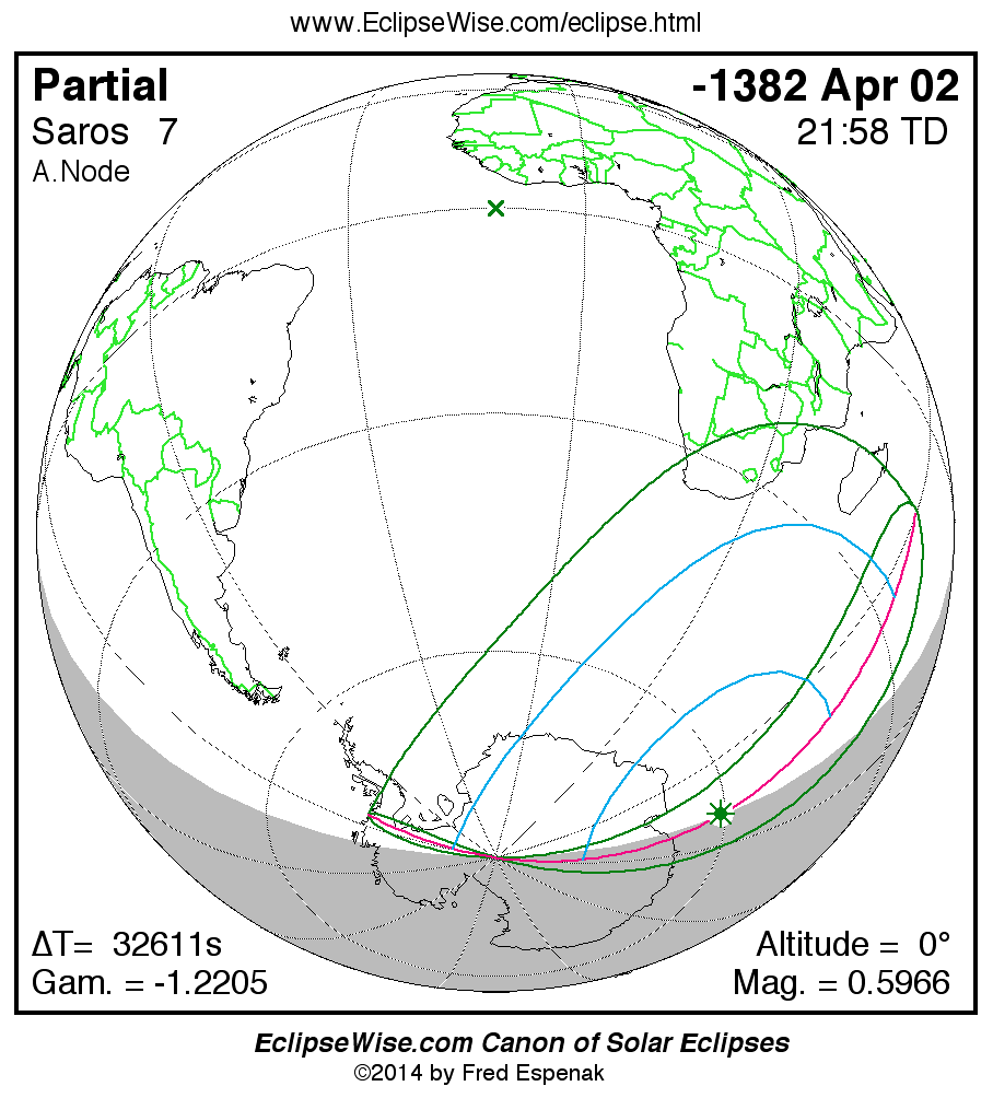 The instant of greatest eclipse takes place on -1382 Apr 02 at 21:57:30 TD (12:54:02 UT1).