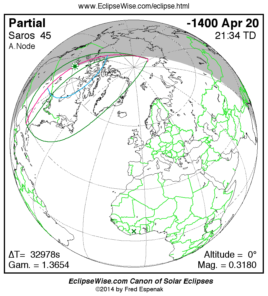 The instant of greatest eclipse takes place on -1400 Apr 20 at 21:33:44 TD (12:24:10 UT1).