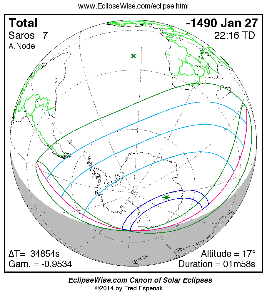 Total Solar Eclipse of -1490 Jan 27 (1491 Jan 27 BCE)