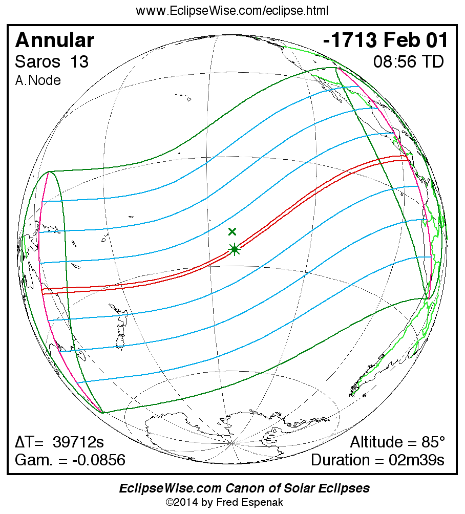 - Path Table: Annular Solar Eclipse of -1713 Feb 02 - coordinates of the central line and path limits