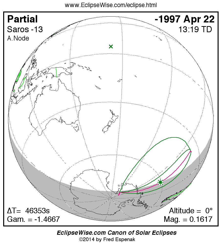 The instant of greatest eclipse takes place on -1997 Apr 22 at 13:18:60 TD (00:26:33 UT1).