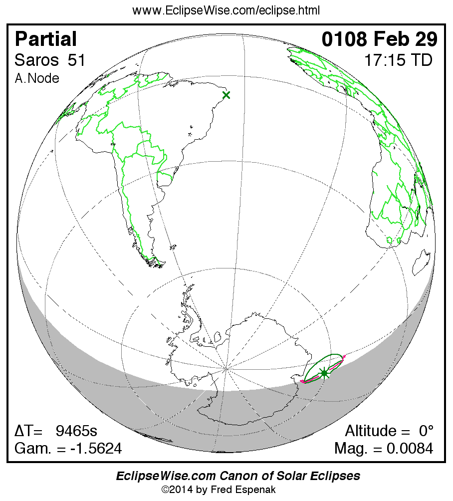 The eclipse belongs to Saros 51 and is number 85 of 85 eclipses in the series. Thus, the 0108 Feb 29 event is the last eclipse of the series . All eclipses in this series occur at the Moons ascending node. The Moon moves southward with respect to the node with each succeeding eclipse in the series and gamma decreases.