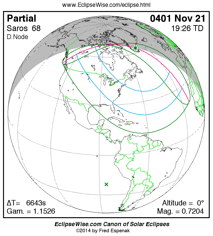 The instant of greatest eclipse takes place on 0401 Nov 21 at 19:25:51 TD (17:35:09 UT1).