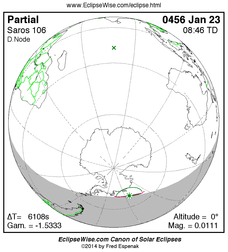 The eclipse belongs to Saros 106 and is number 1 of 75 eclipses in the series. Thus, the 0456 Jan 23 event is the very first eclipse of the series . All eclipses in this series occur at the Moons descending node. The Moon moves northward with respect to the node with each succeeding eclipse in the series and gamma increases.