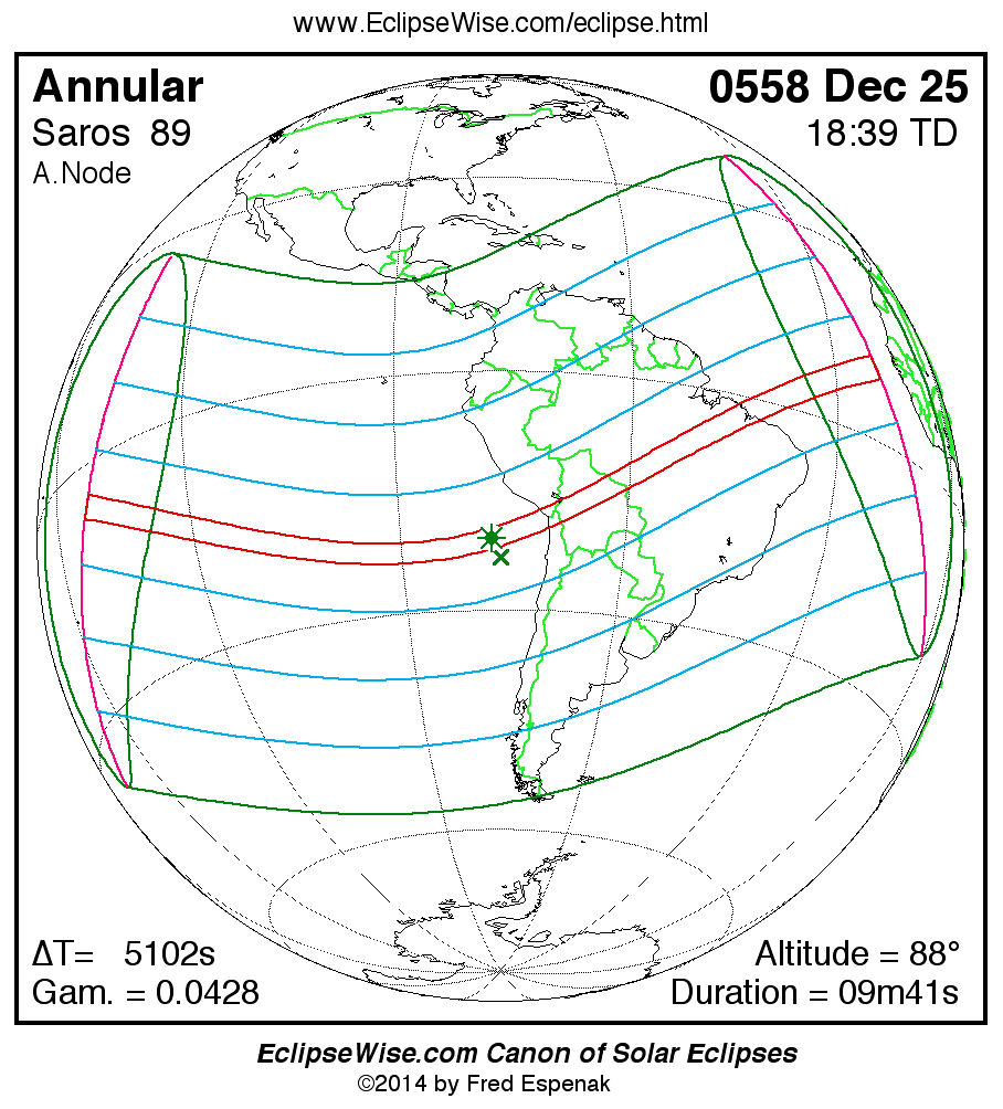 - Path Table: Annular Solar Eclipse of 0558 Dec 25 - coordinates of the central line and path limits