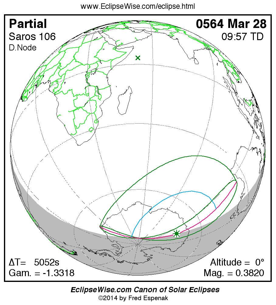 The instant of greatest eclipse takes place on 0564 Mar 28 at 09:57:05 TD (08:32:54 UT1).