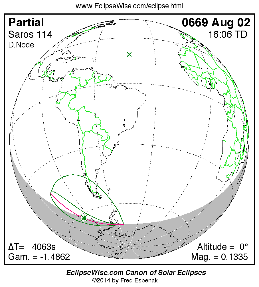 The instant of greatest eclipse takes place on 0669 Aug 02 at 16:05:57 TD (14:58:14 UT1).