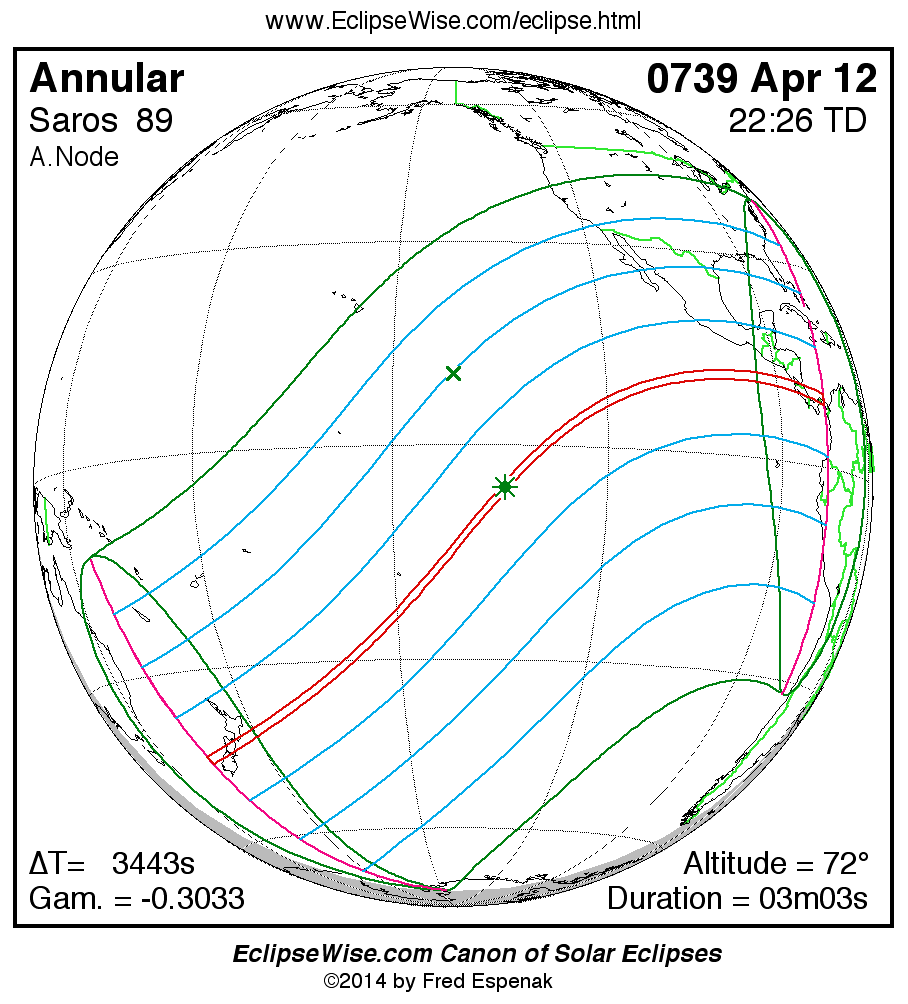 The instant of greatest eclipse takes place on 0739 Apr 12 at 22:26:25 TD (21:29:02 UT1).