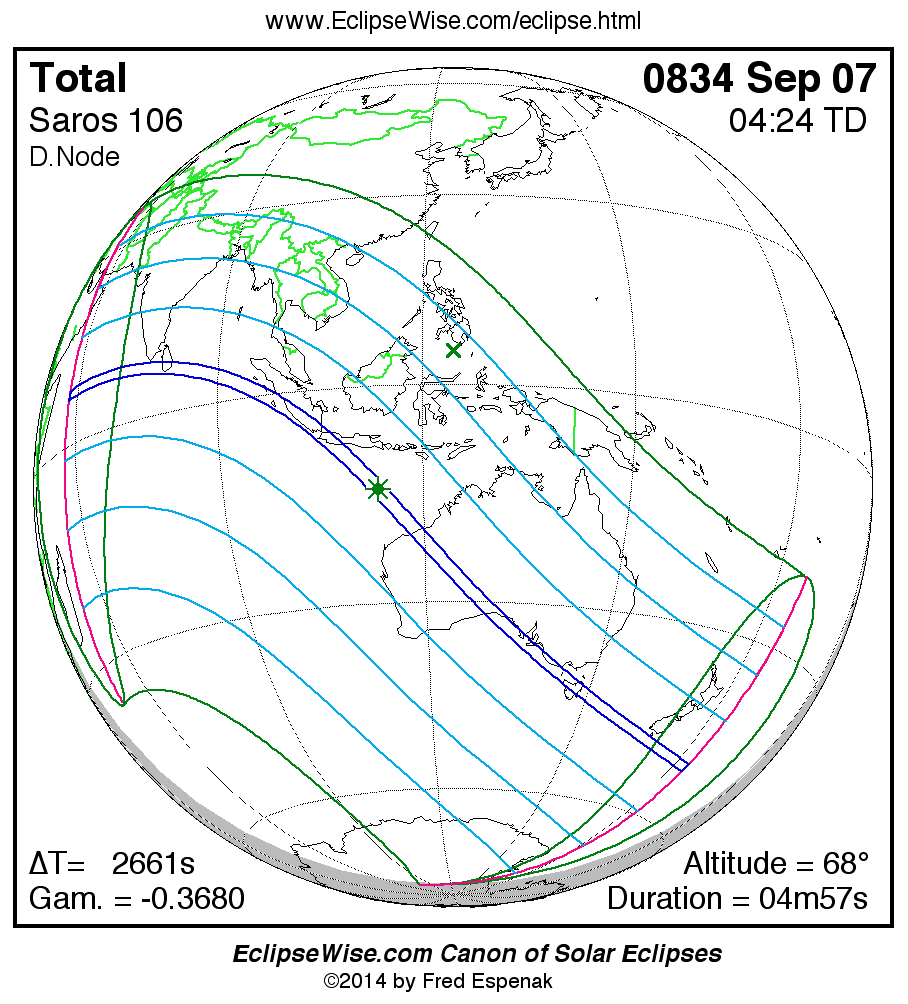 - Orthographic Map: Total Solar Eclipse of 0834 Sep 07 - global map of eclipse visibility