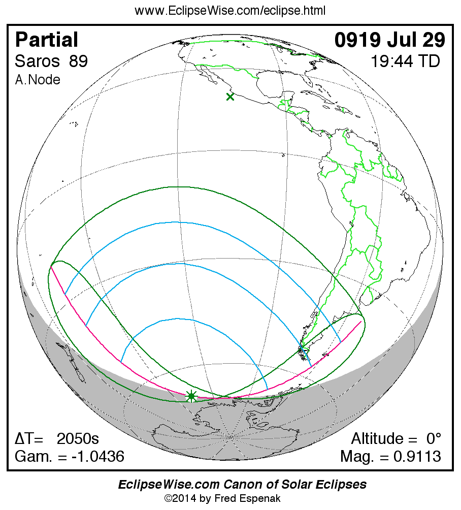 The instant of greatest eclipse takes place on 0919 Jul 29 at 19:43:59 TD (19:09:49 UT1).