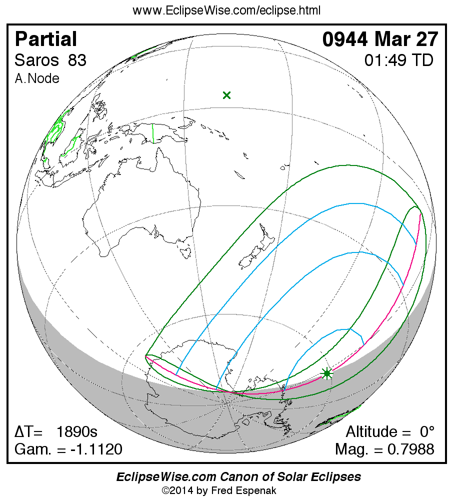 The instant of greatest eclipse takes place on 0944 Mar 27 at 01:48:33 TD (01:17:02 UT1).