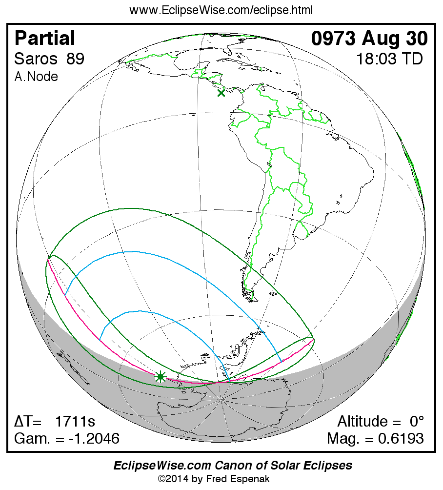 The instant of greatest eclipse takes place on 0973 Aug 30 at 18:03:07 TD (17:34:36 UT1).