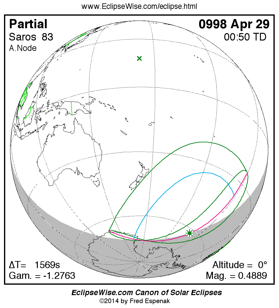 The instant of greatest eclipse takes place on 0998 Apr 29 at 00:49:42 TD (00:23:33 UT1).